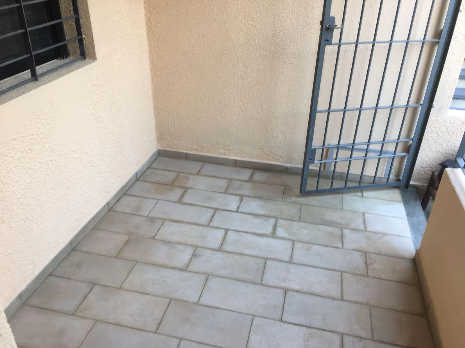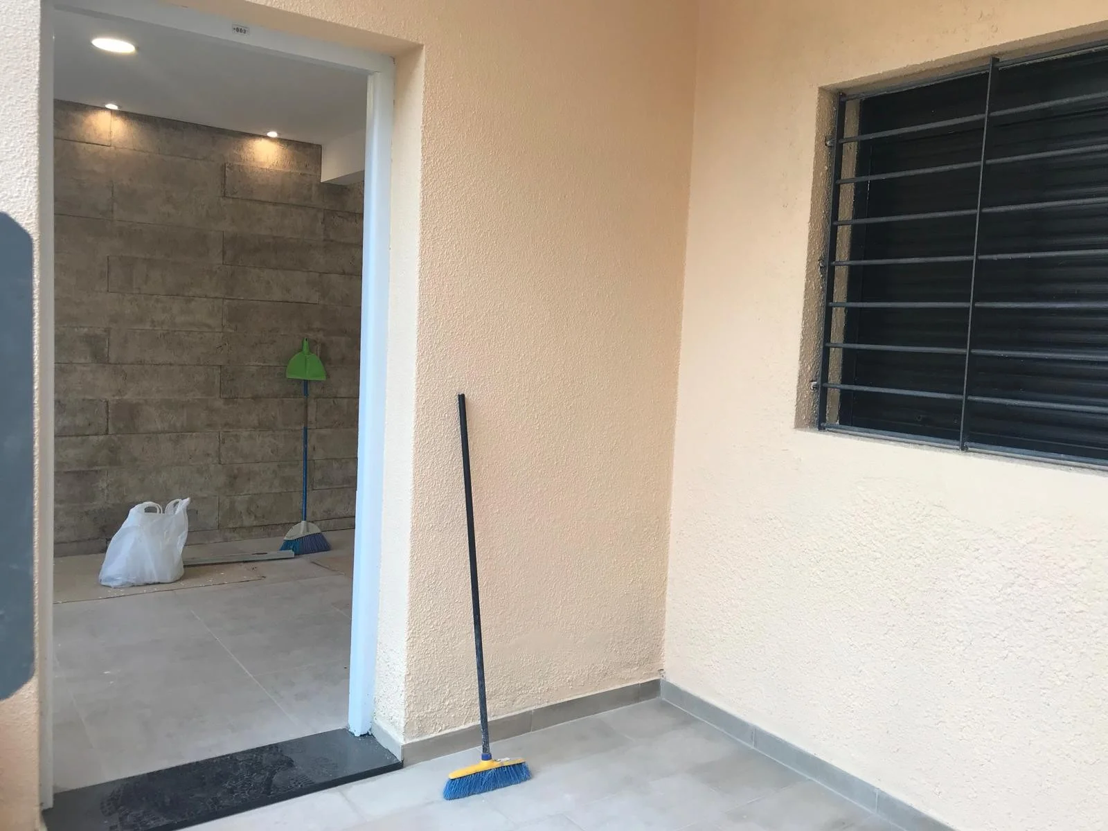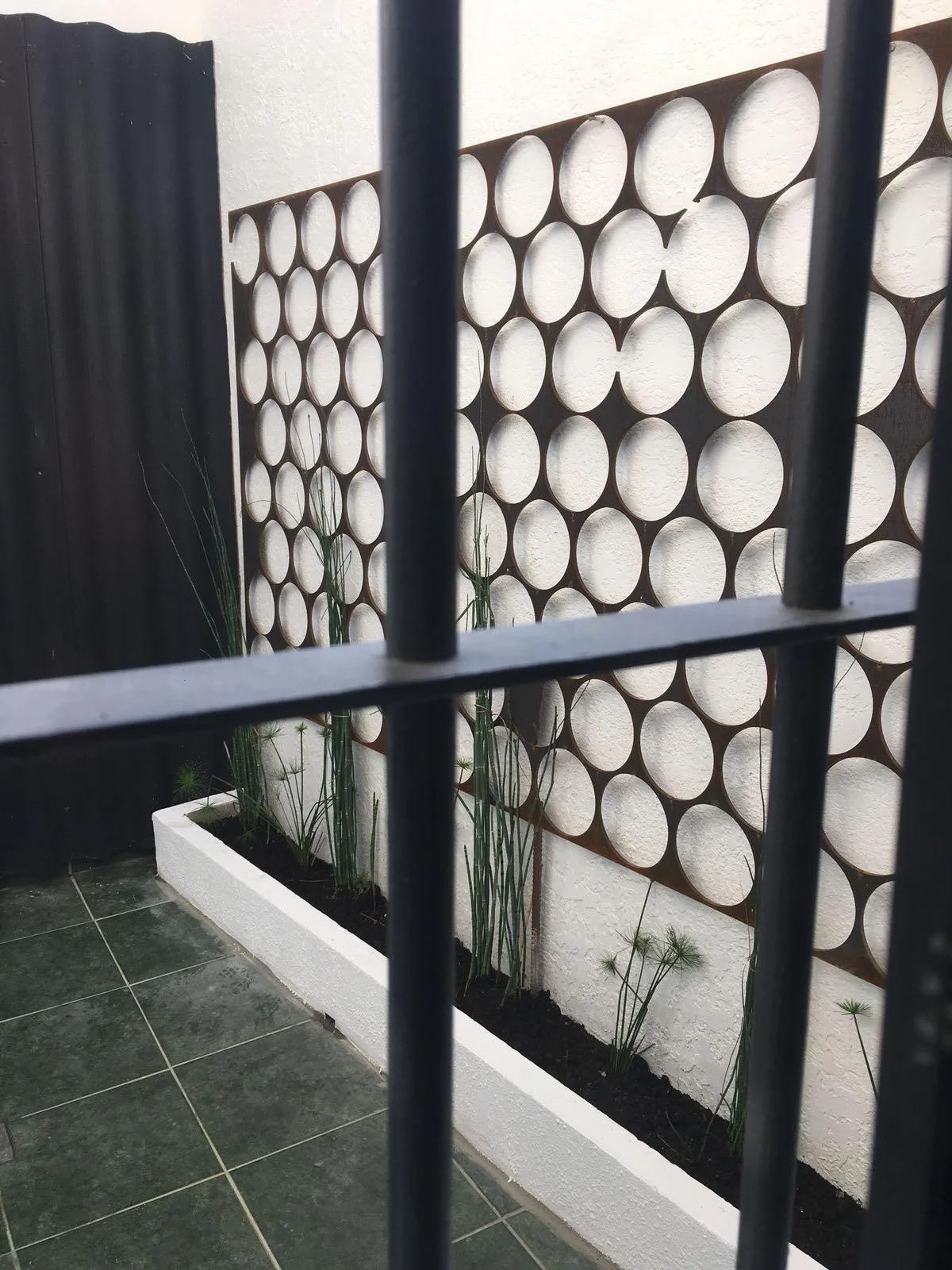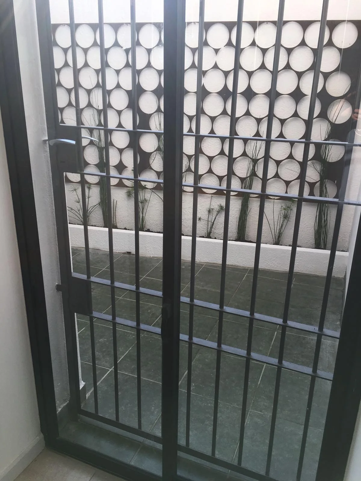 El acceso desde la calle por un pasillo lateral, que conduce a un pequeño porche de entrada cerrado con rejas y techado, generando un espacio previo cómodo y seguro.