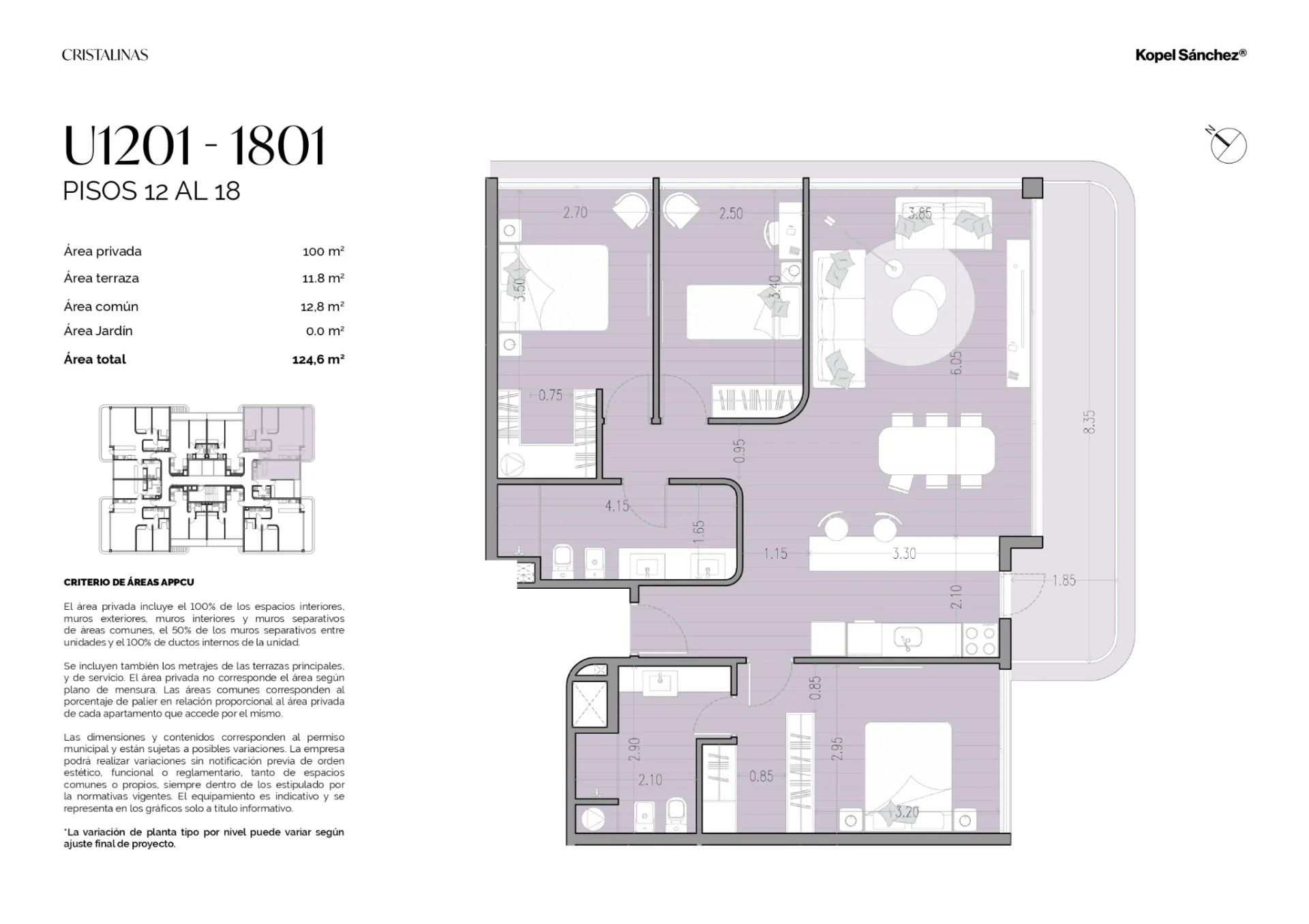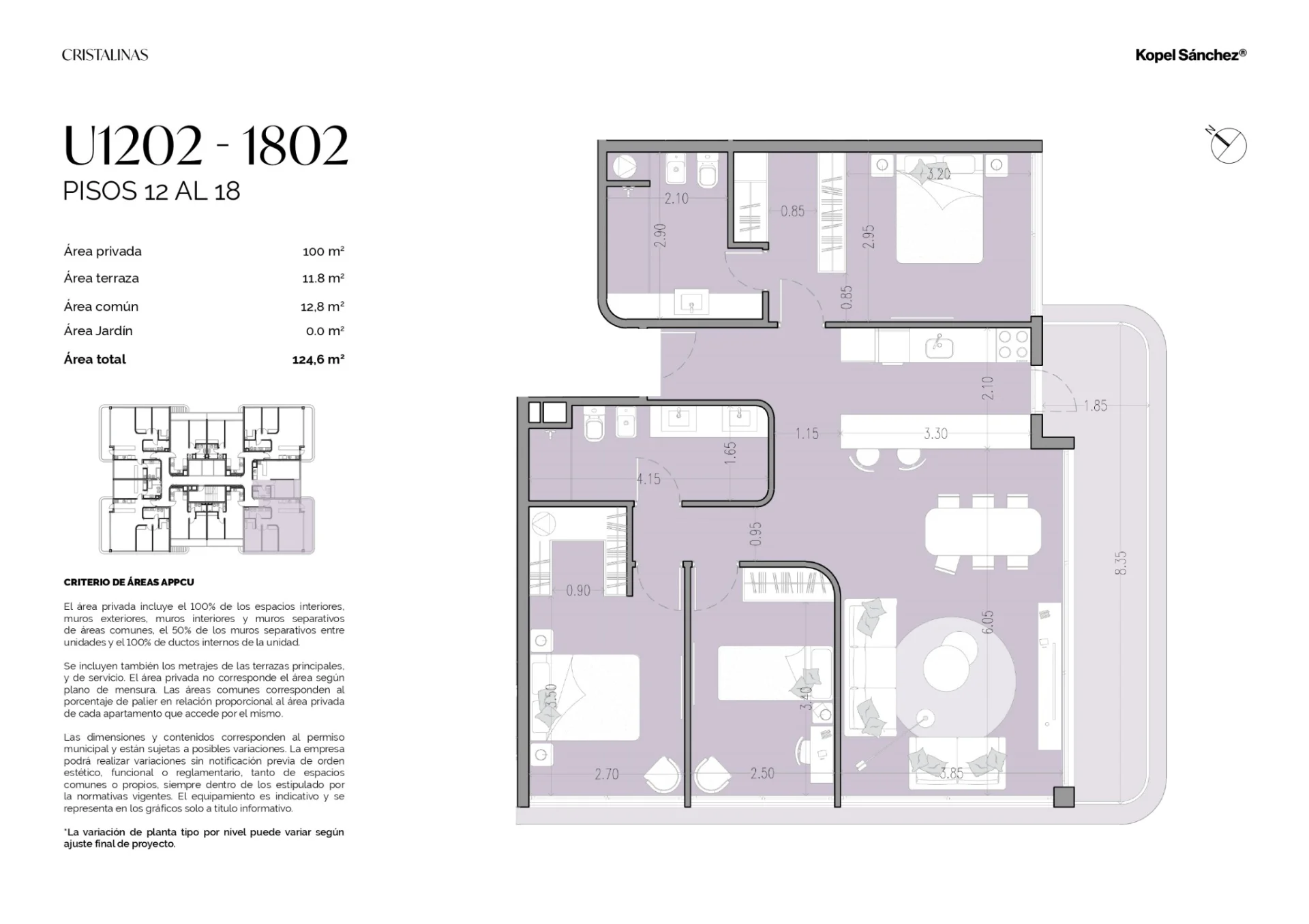 Cuentan con 112 m2 totales: 100 m² interiores + terrazas de 12 m². Disponen de living comedor integrado con moderna cocina con isla, y 3 dormitorios, el principal en suite con vestidor, y 2 dormitorios que comparten un baño.