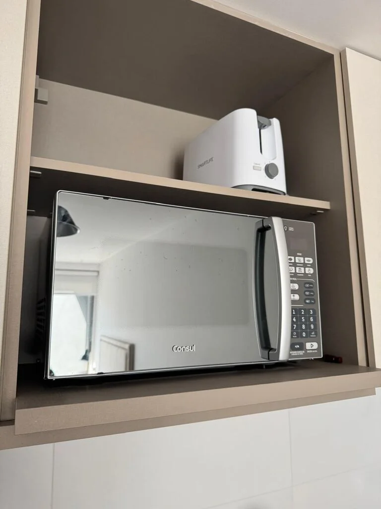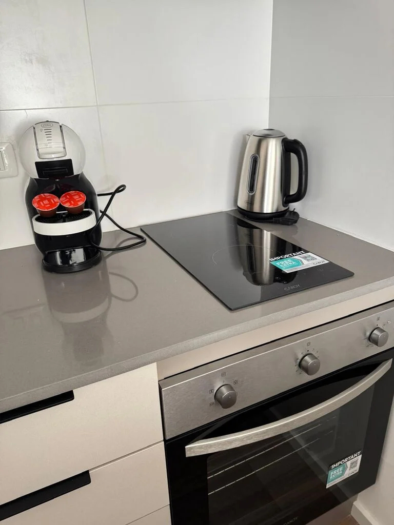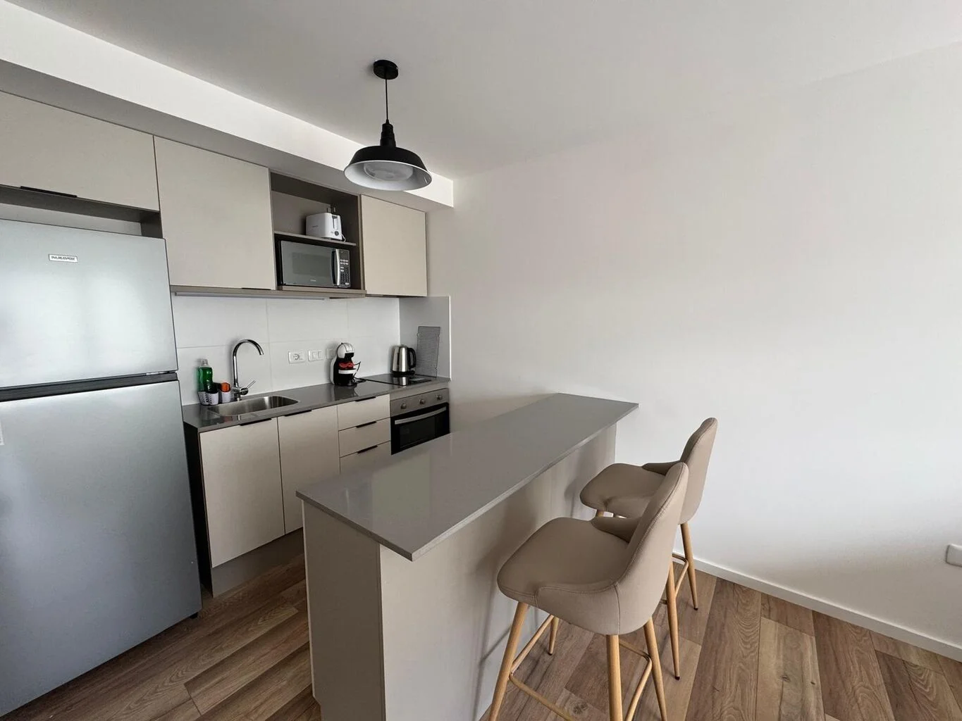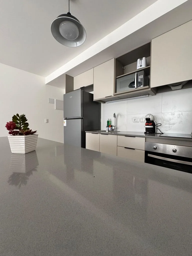 Cocina integrada con placares, heladera, microondas, anafe, bateria de cocina, cafetera Dolce gusto, vajilla completa.