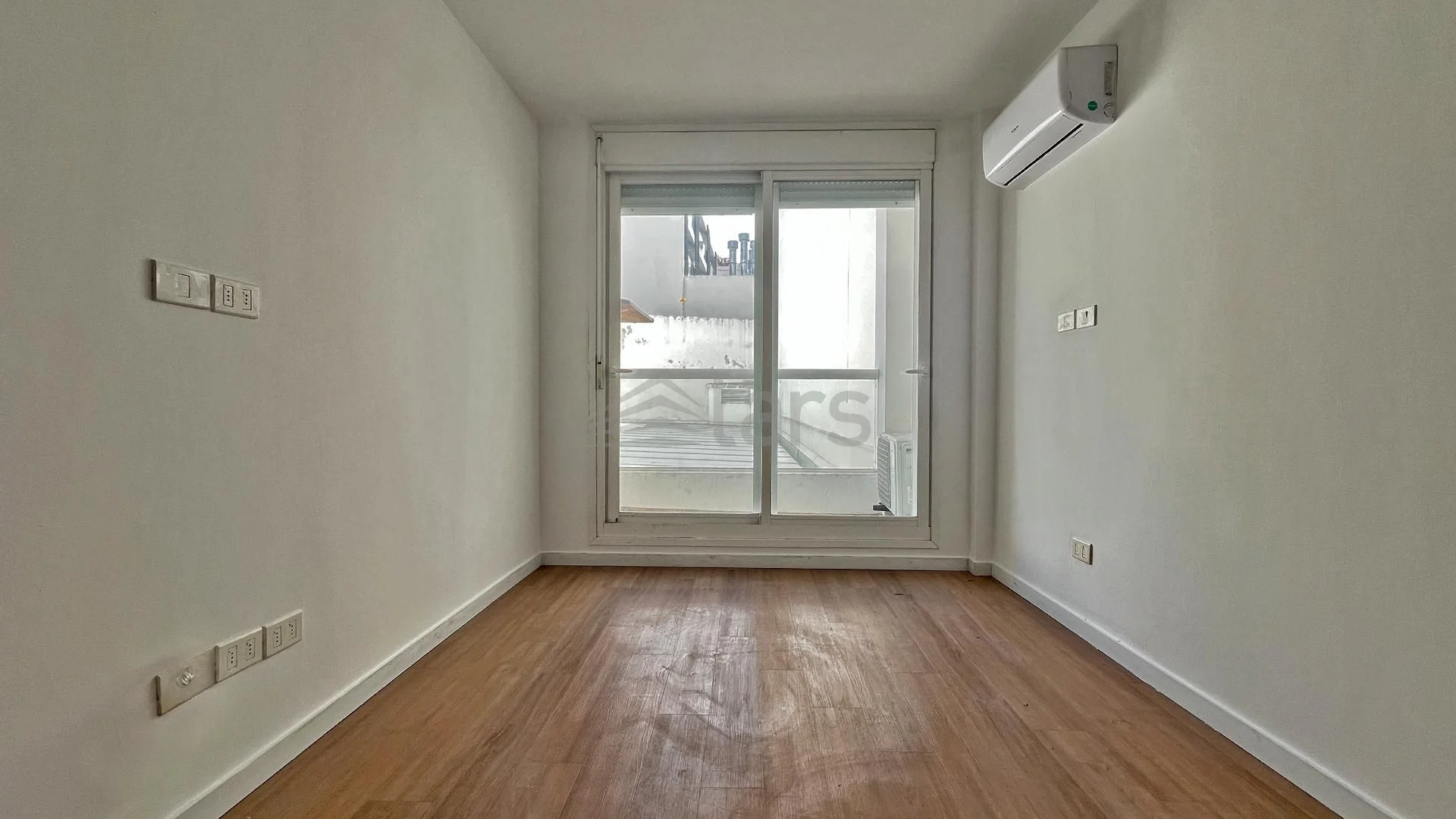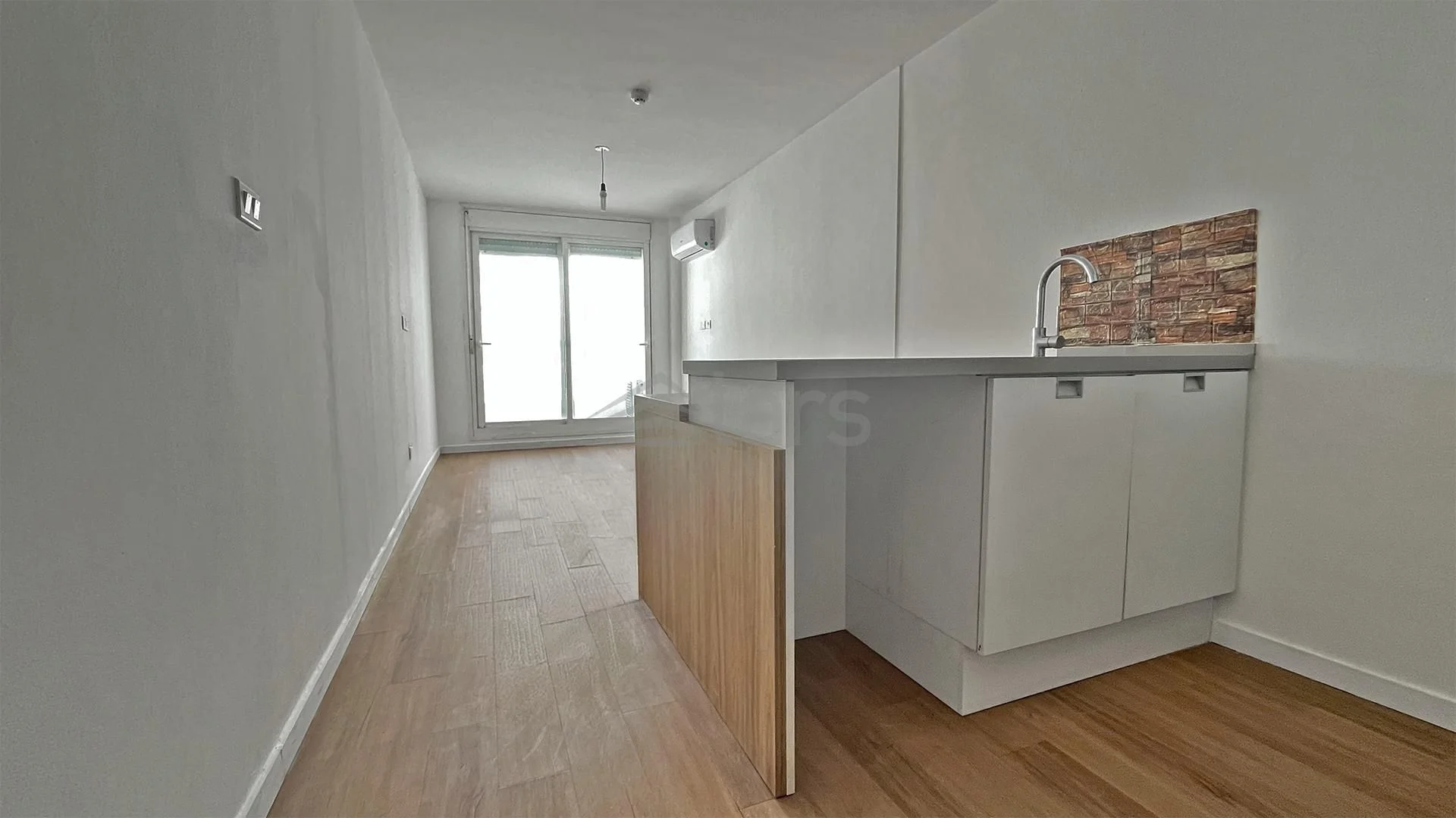 Propiedad contrafrente en 1° piso, ambiente con aire acondicionado y cocina integrada, baño y terraza. El edificio cuenta con ascensor, portería, barbacoa, laundry y gimnasio.