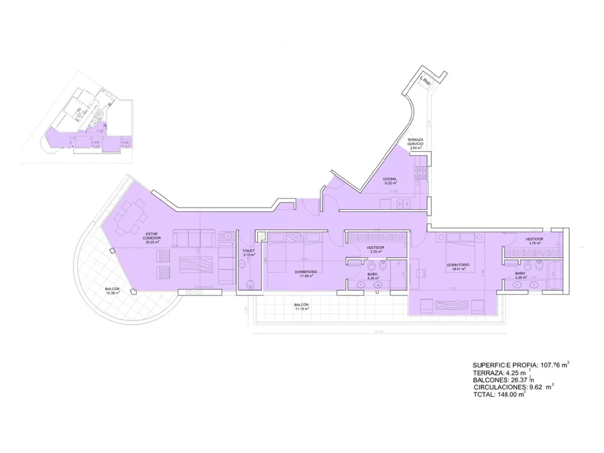 107,76m² interiores + 30,63m² de terrazas y balcones + 9,62m² de circulaciones.