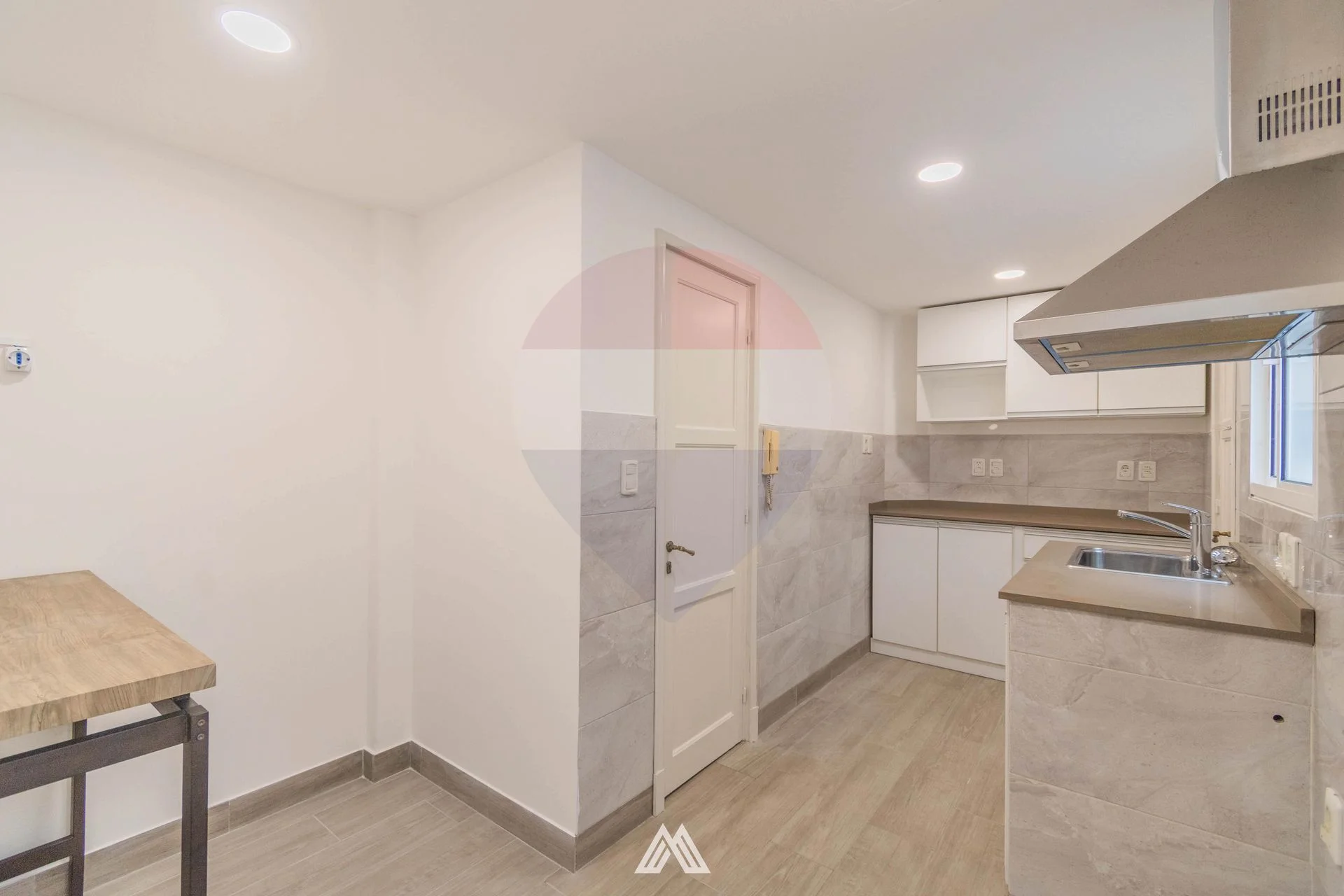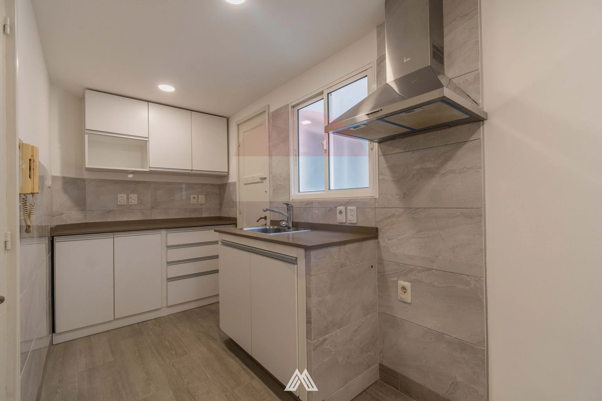 2 baños completos y cocina definida con buena capacidad de almacenamiento, campana, puerta de servicio y office.