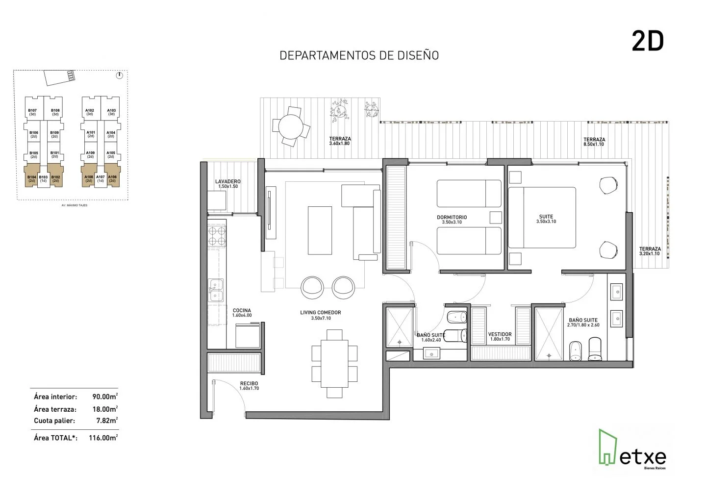 Pasillo conecta a dos dormitorios y baño completo. Dormitorio principal en suite con vestidor. Dormitorio secundario con placares. Ambos cuentan con salida a terraza.