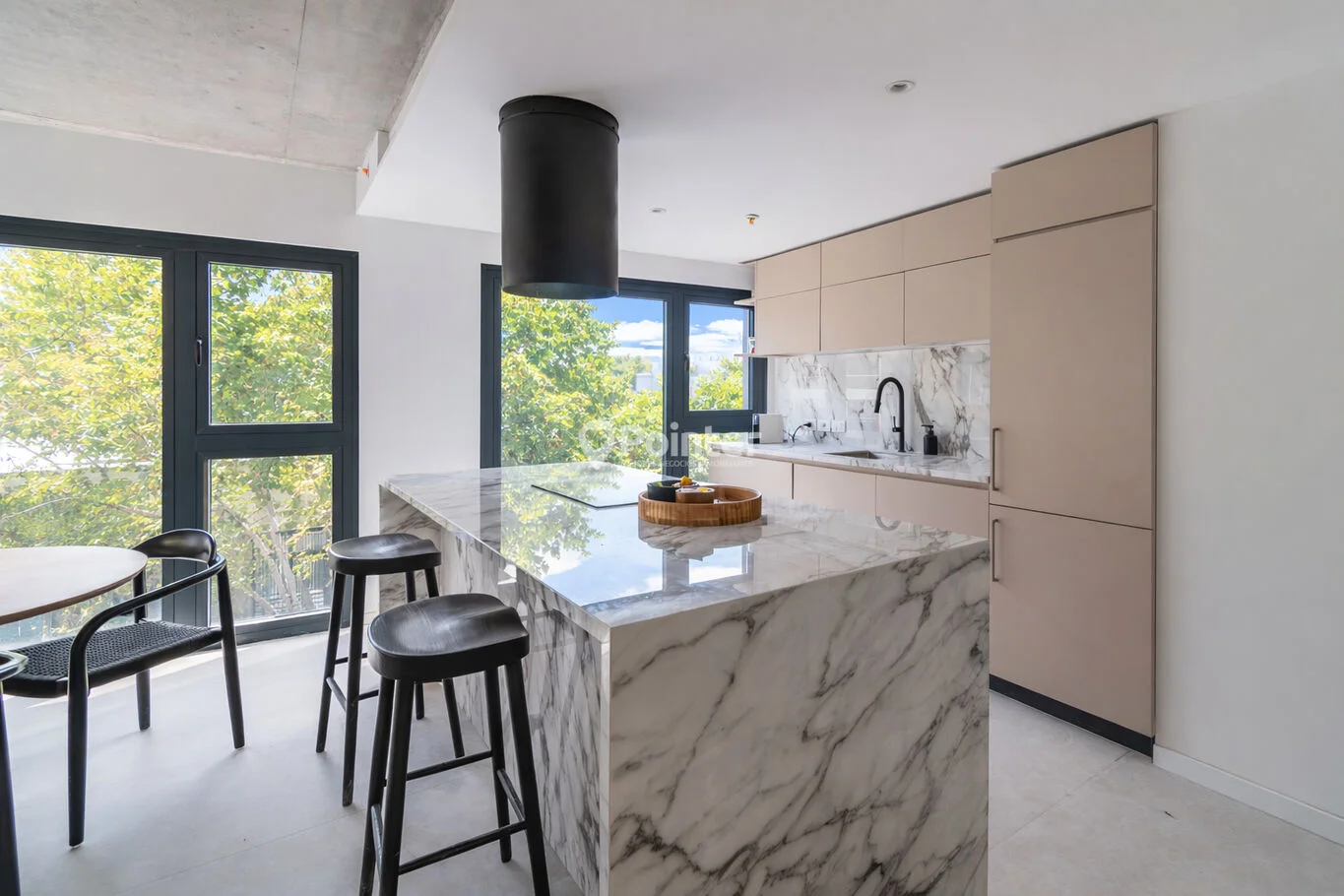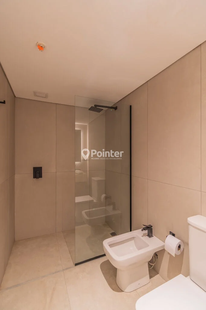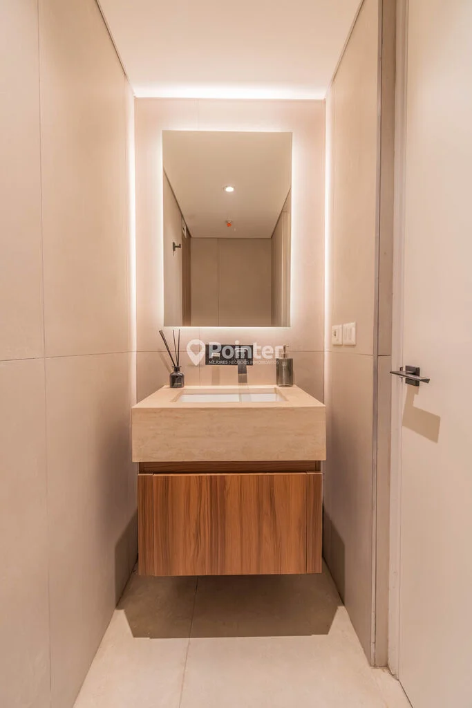 - Baños con diseño contemporáneo: bacha de travertino natural, griferías empotradas en negro y espejo retroiluminado