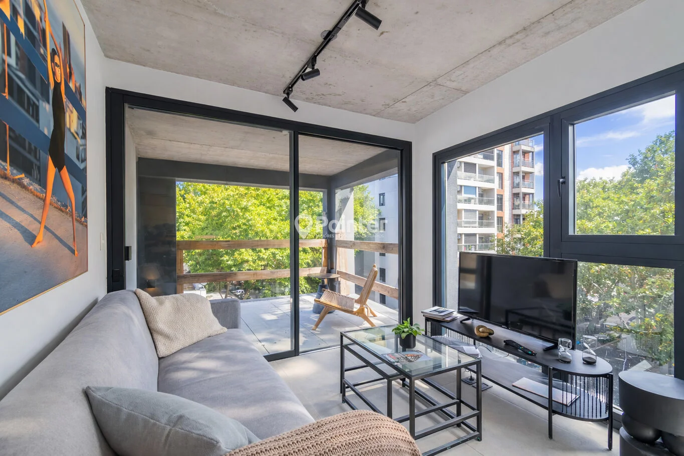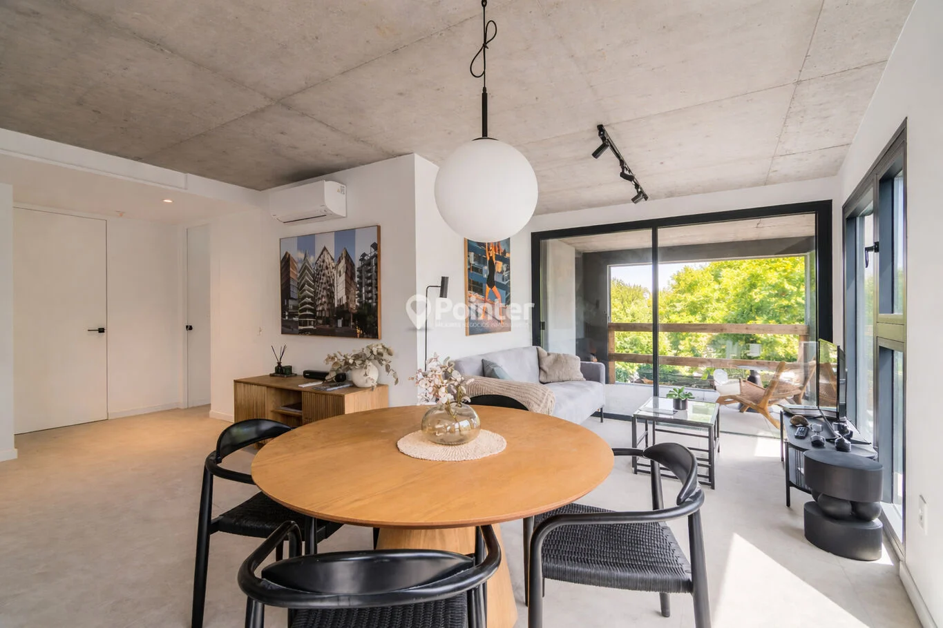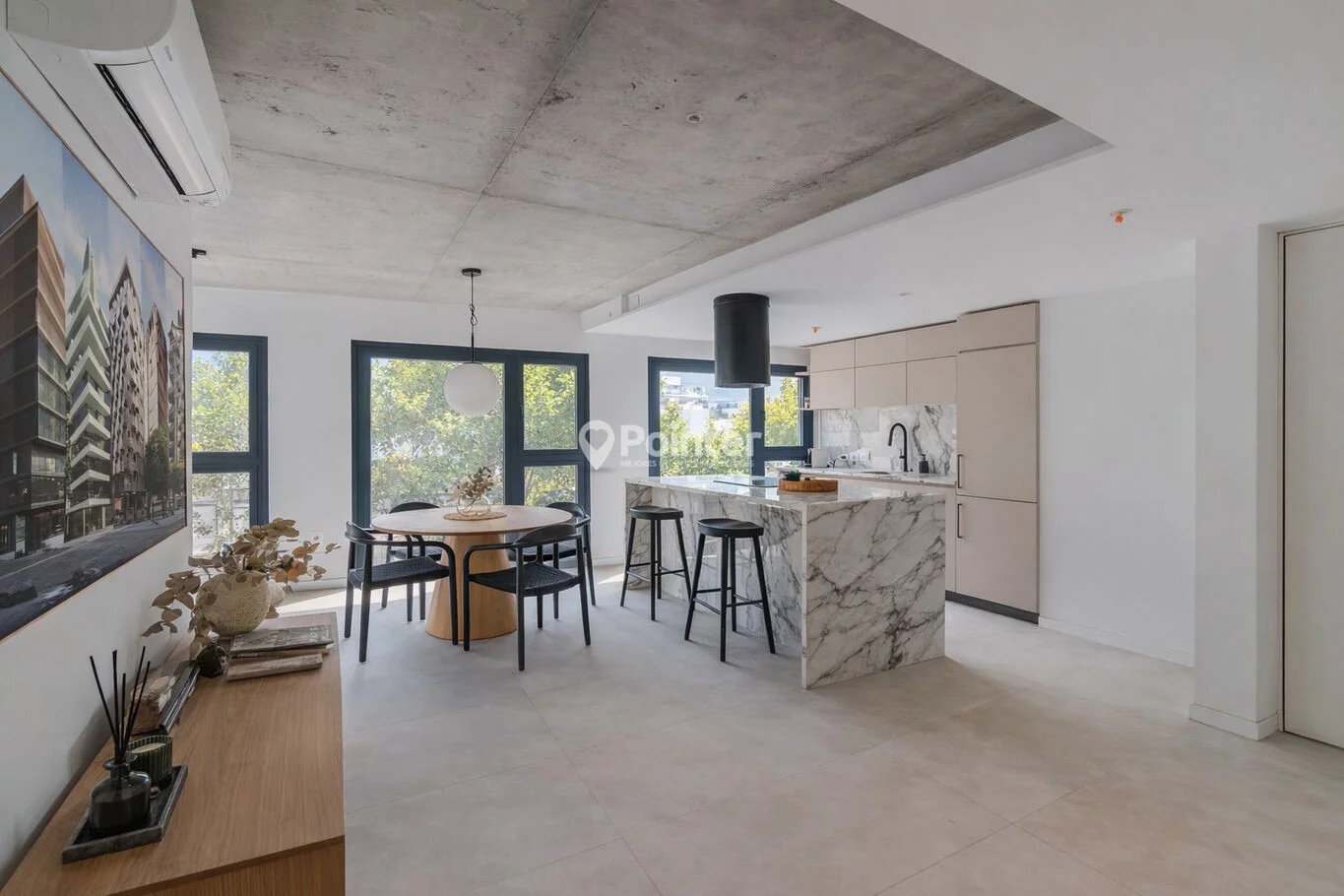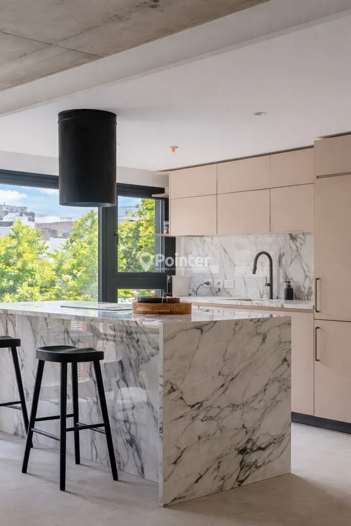 - Pisos de porcelanato de gran formato (120x60) en interiores y terrazas, aportando continuidad y durabilidad