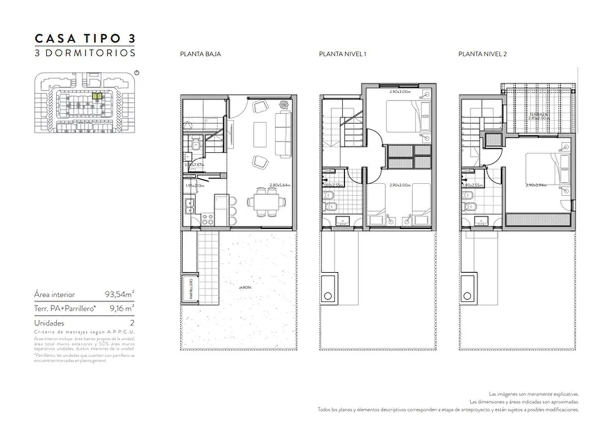 Tipología 3, desarrollada en 3 niveles. Living comedor con cocina integrada y salida a jardín con parrillero. Toilette. En primer piso 2 dormitorios y 1 baño y es segundo piso suite principal con terraza. Todos los dormitorios con placares. Estacionamiento para 1 auto.