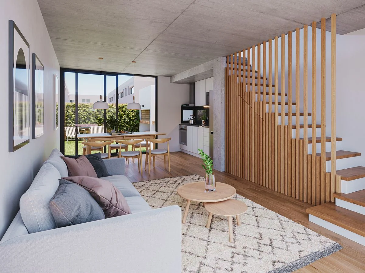 Tipología 1, desarrollada en 2 plantas. Living comedor con cocina integrada y salida a jardín con parrillero. En la parte superior 2 dormitorios y 1 baño. Estacionamiento para 1 auto.