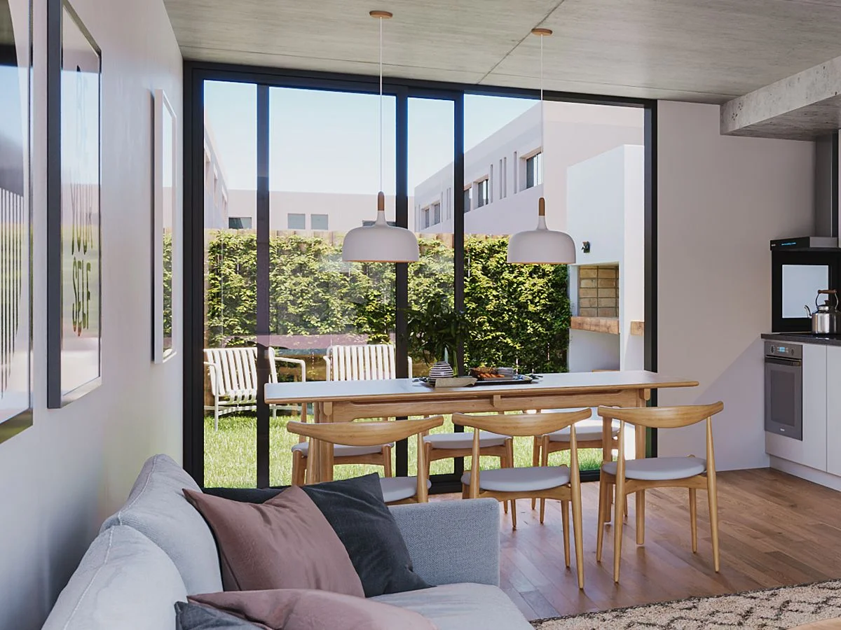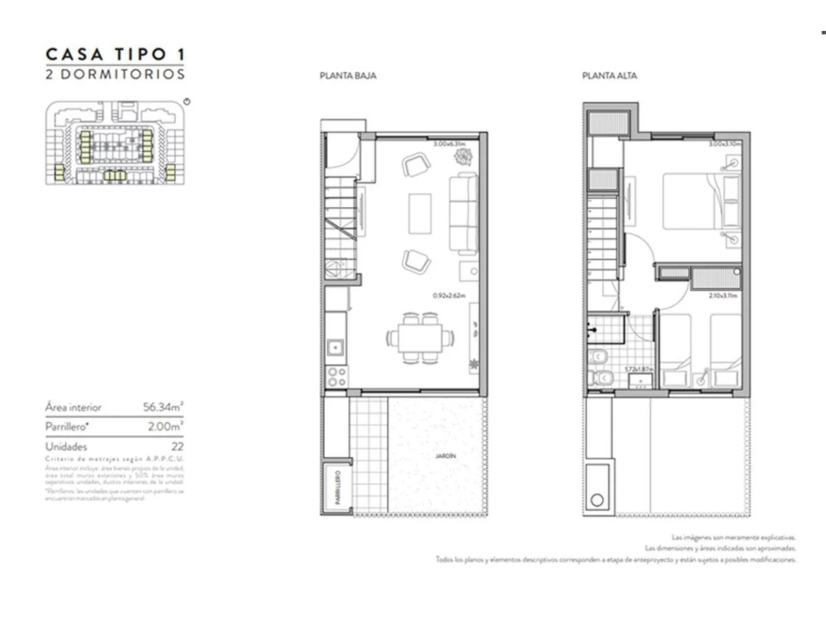 56,34m² interiores + 2,28m² de parrillero + 10m² de jardín