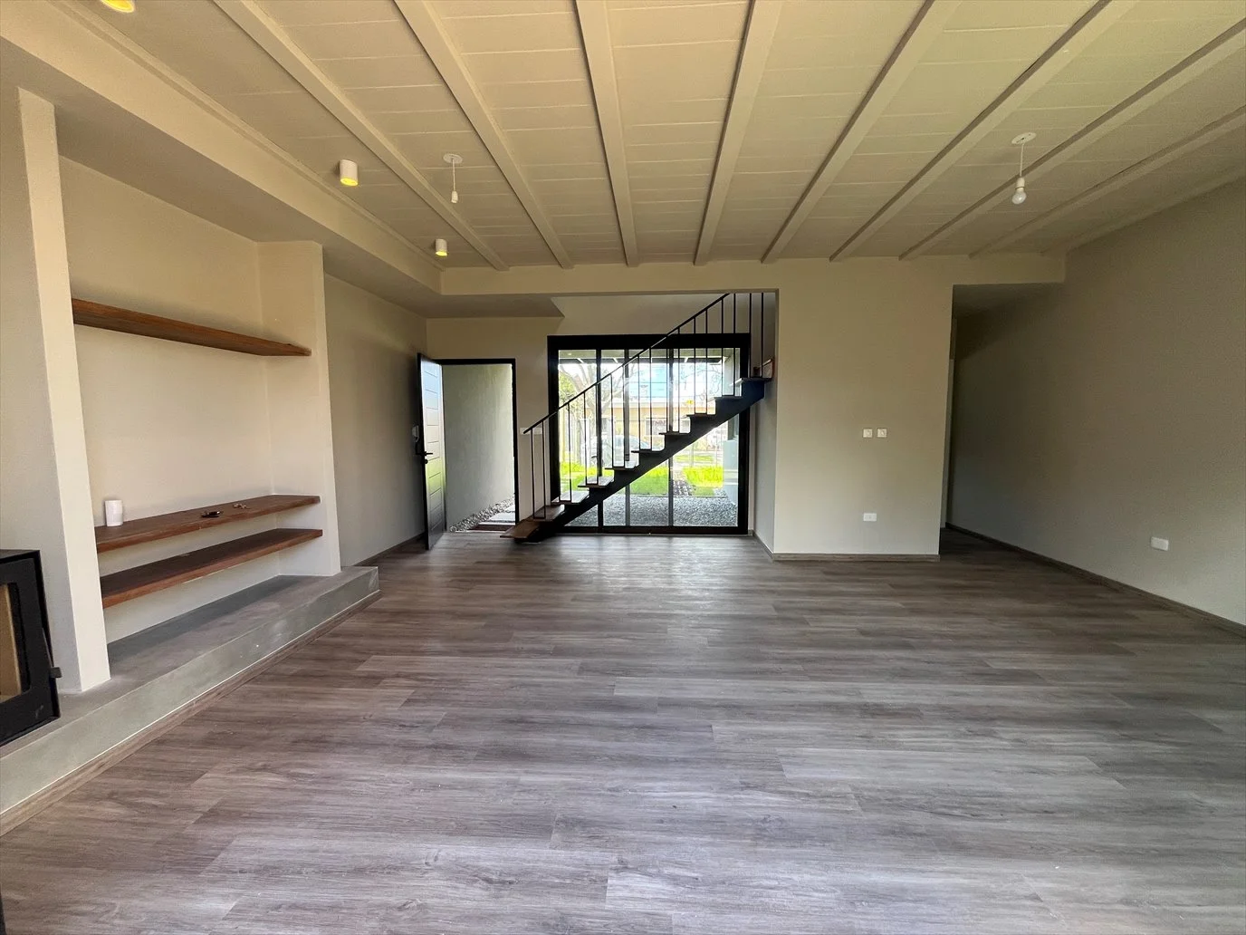 Living comedor con estufa de alto rendimiento. Grandes ventanales con salida al deck con parrillero y box para lavarropa y secarropa.