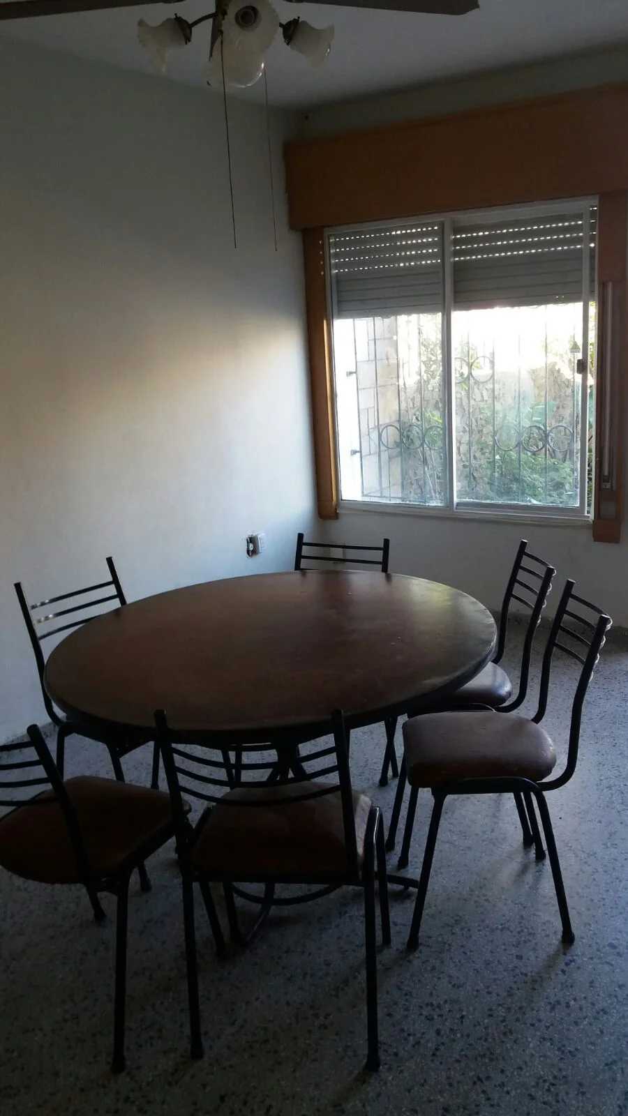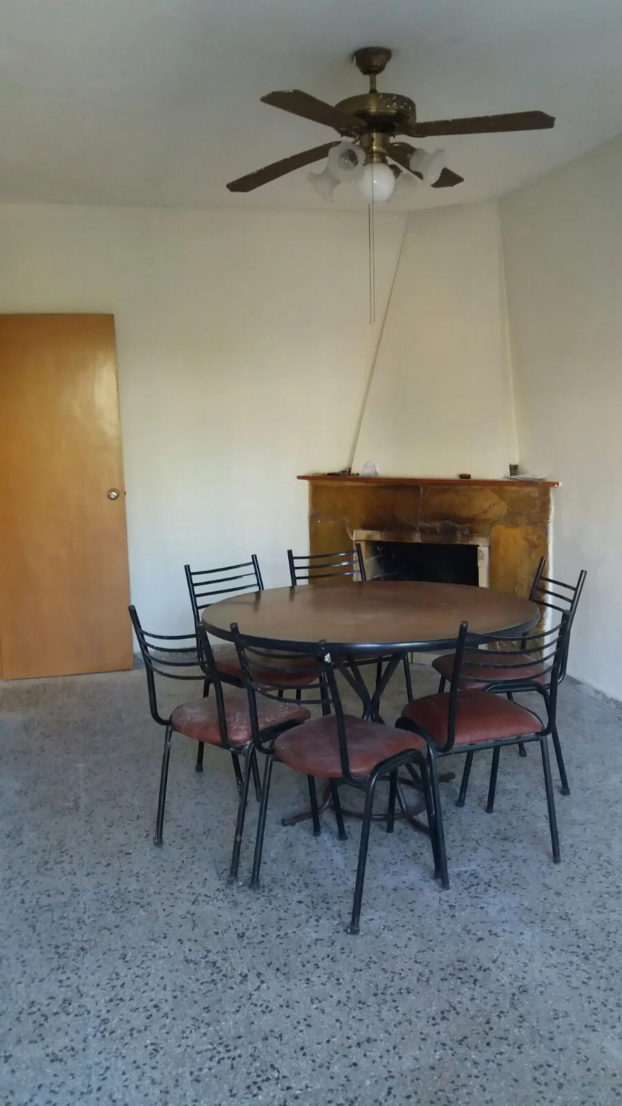 El comedor se sitúa al frente e incluye una estufa a leña. La casa cuenta con dos dormitorios de buen tamaño, ambos con pisos de parquet y placares empotrados. La cocina es amplia y está equipada con placares aéreos y bajo mesada, ofreciendo buena capacidad de almacenamiento.