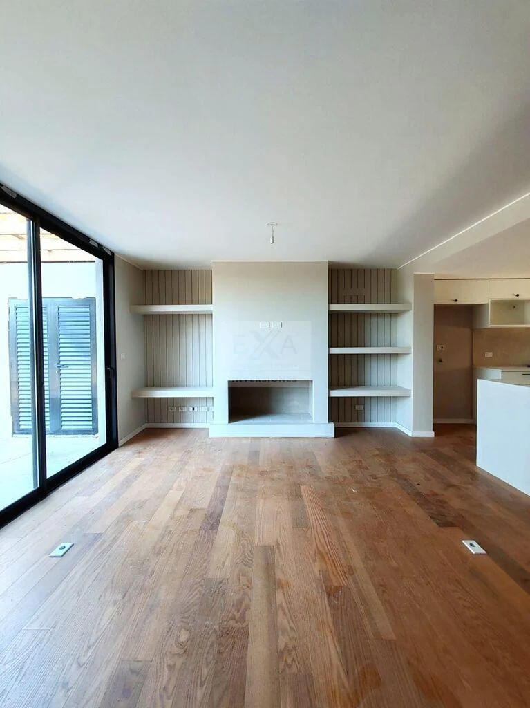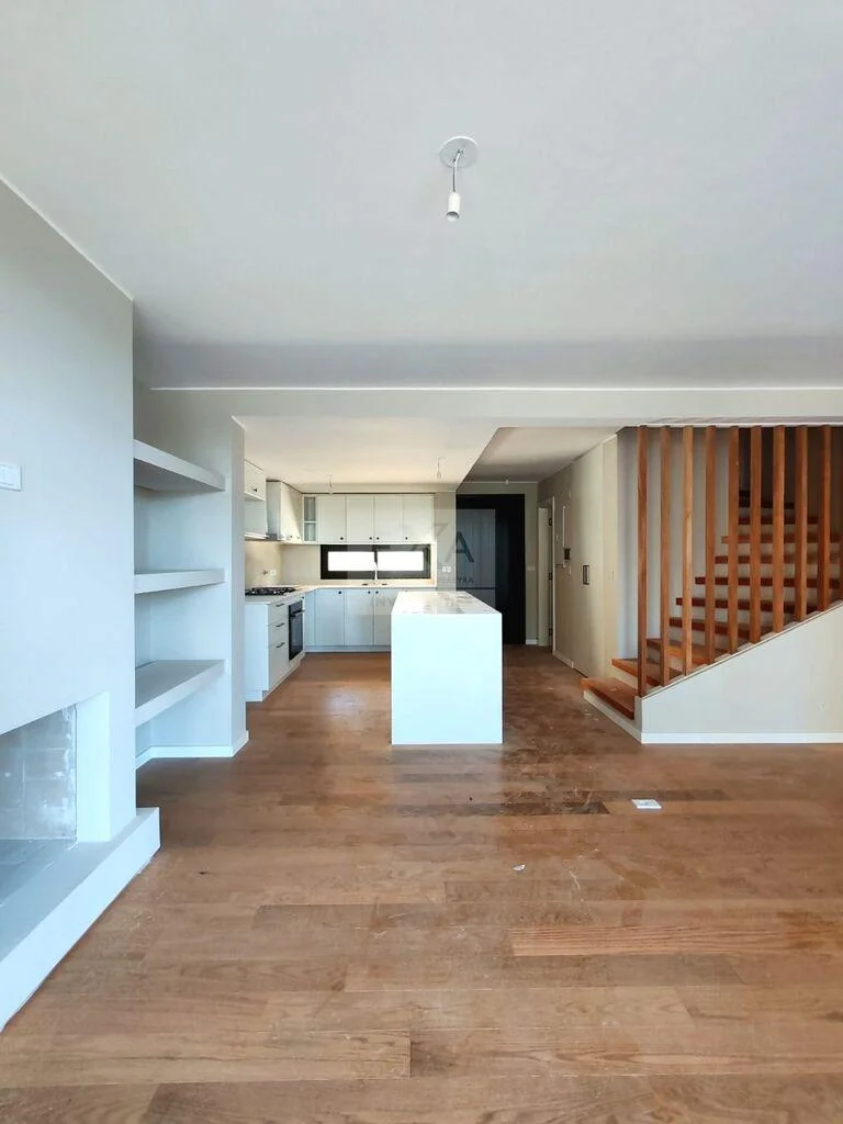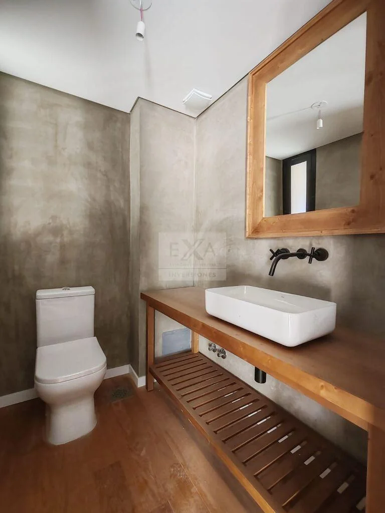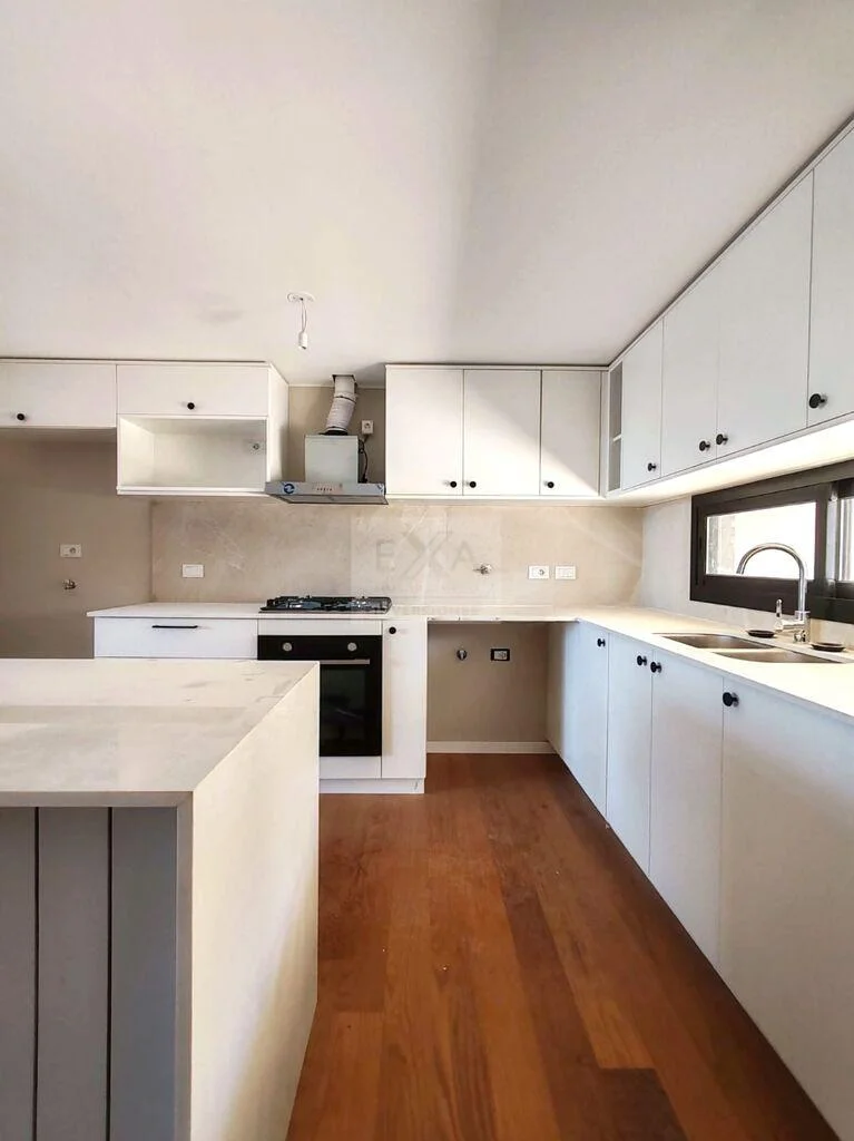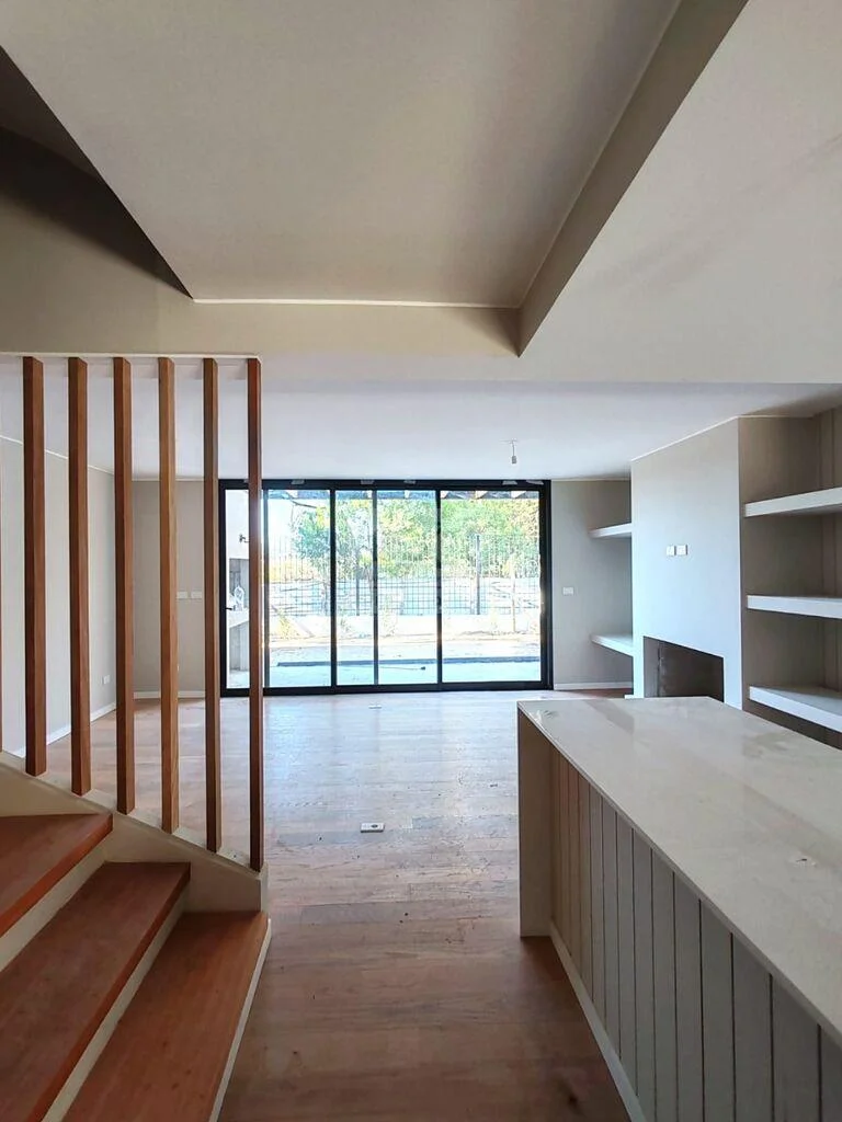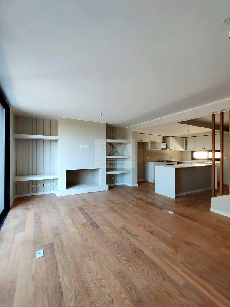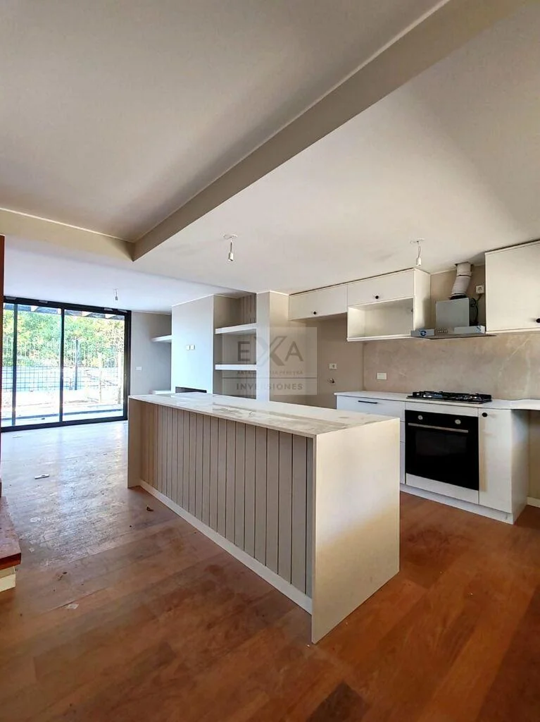 Hall de entrada, baño social, cocina moderna esquipada con horno, anafe, campana, muebles aéreos y gran isla. Living comedor amplio con estufa de leña y ventanales con salida al jardín privado con parrillero.