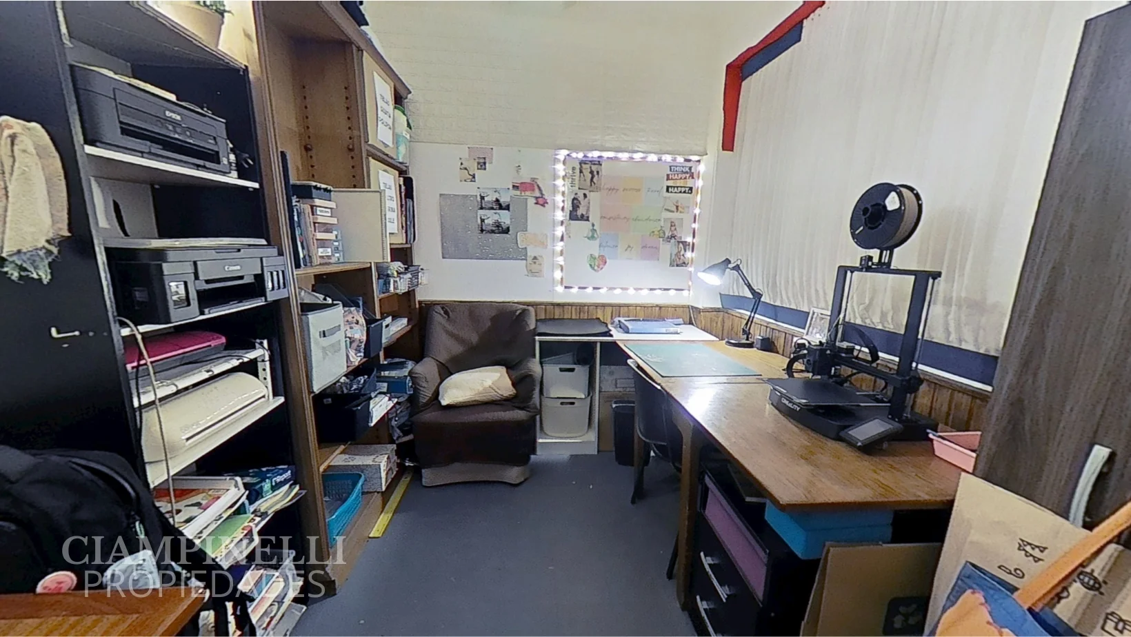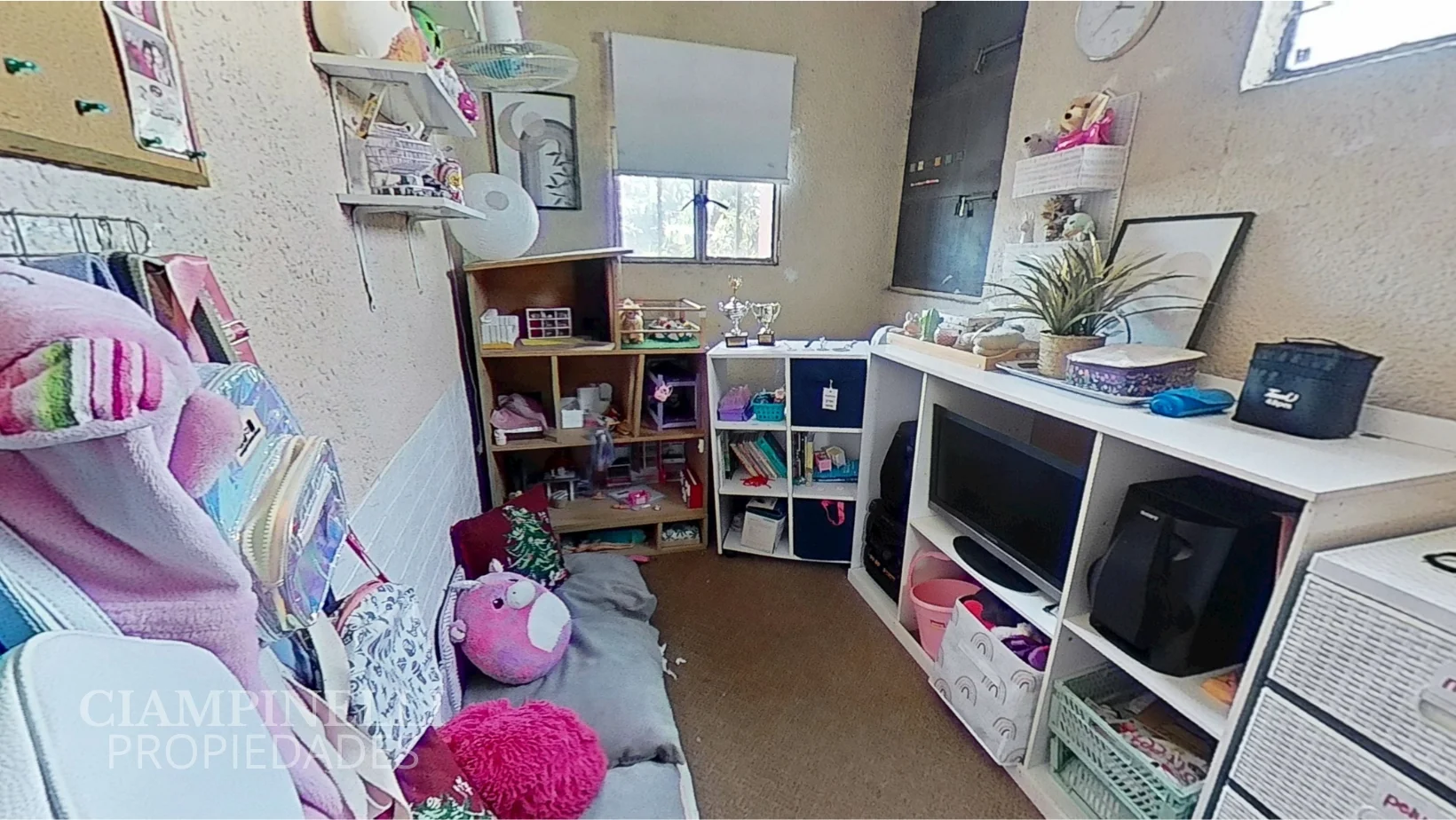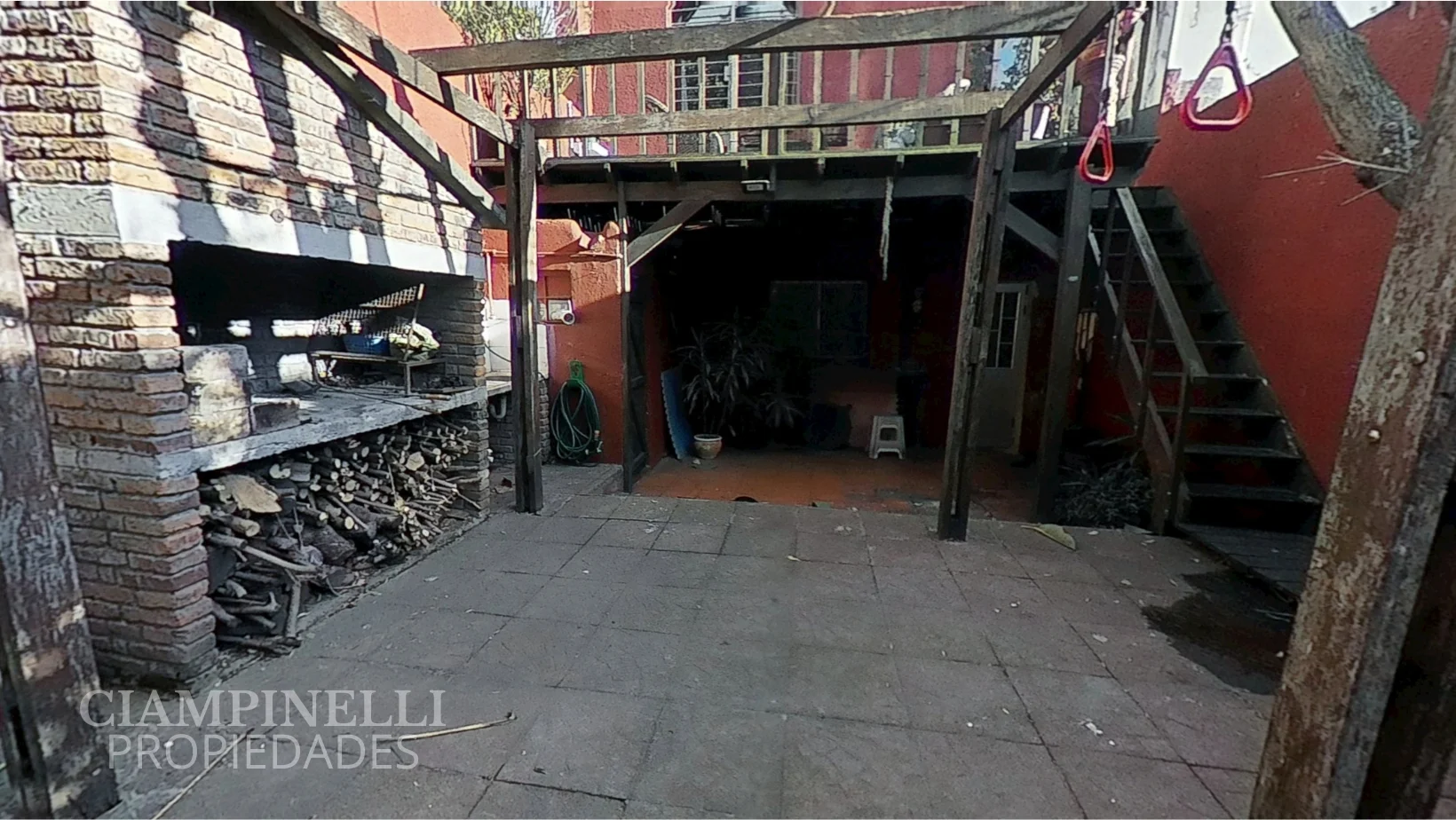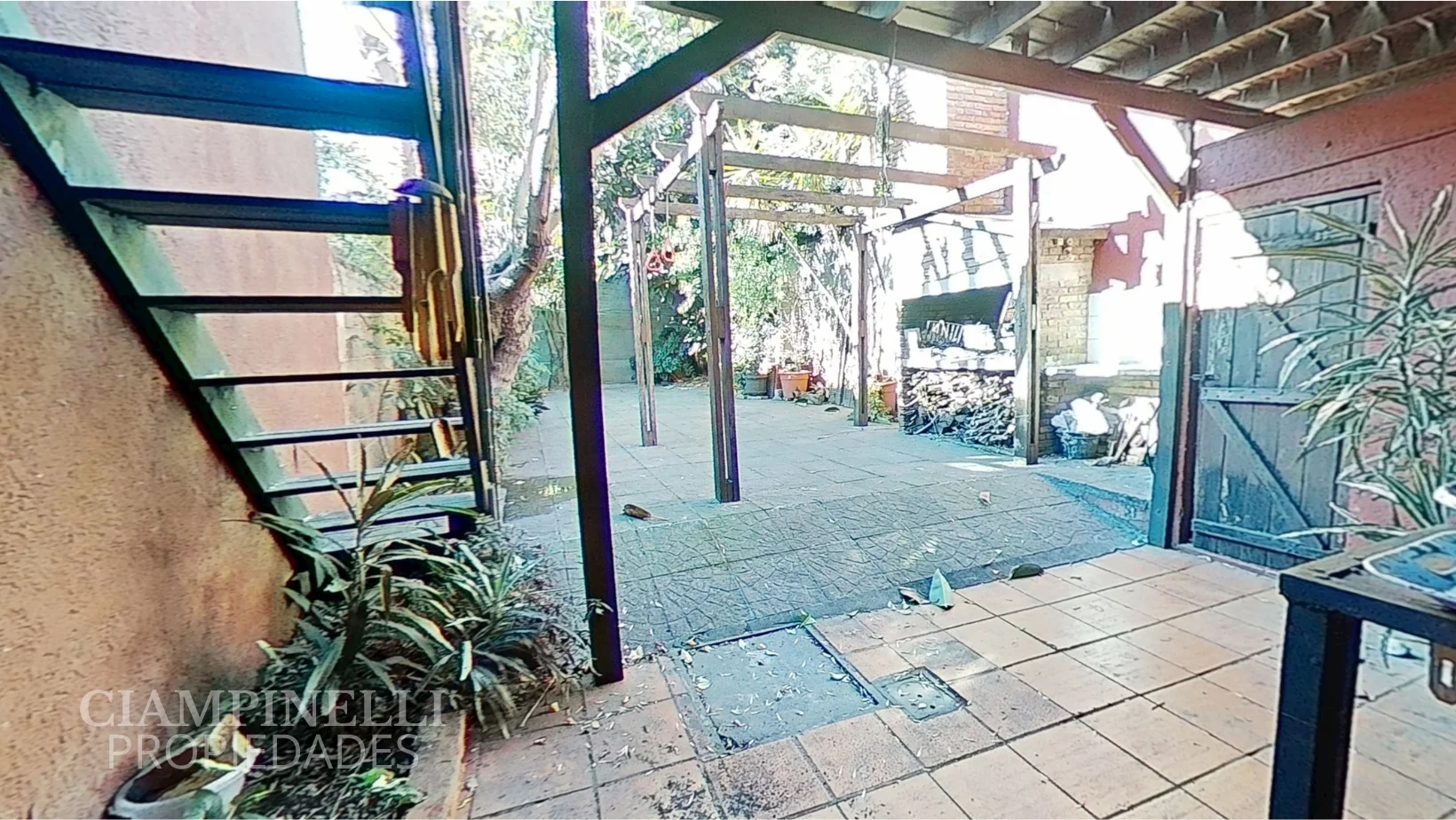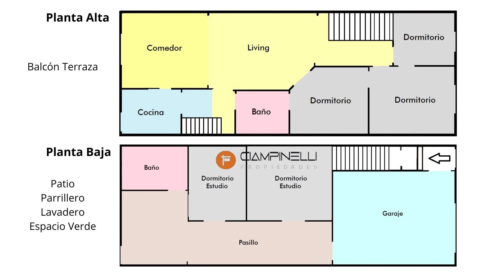 Planta Baja: Garaje para 2 autos, 2 ambientes de estudio o dormitorio con espacio de guardado bajo escalera, baño completo y salida al patio de 96 m2 con parrillero, lavadero y zona verde.