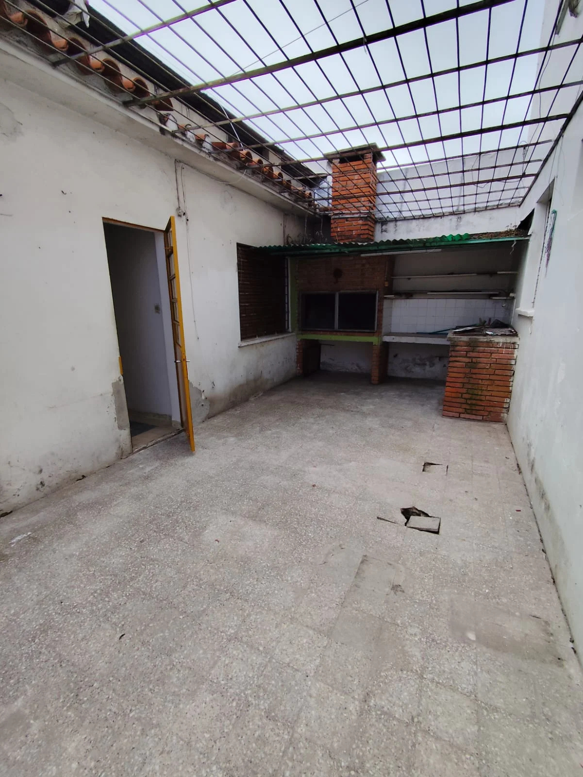 Jardín al frente con entrada vehicular y patio al fondo amplio con parrillero.