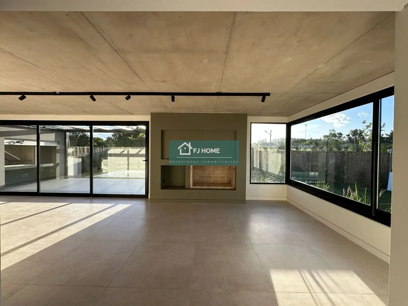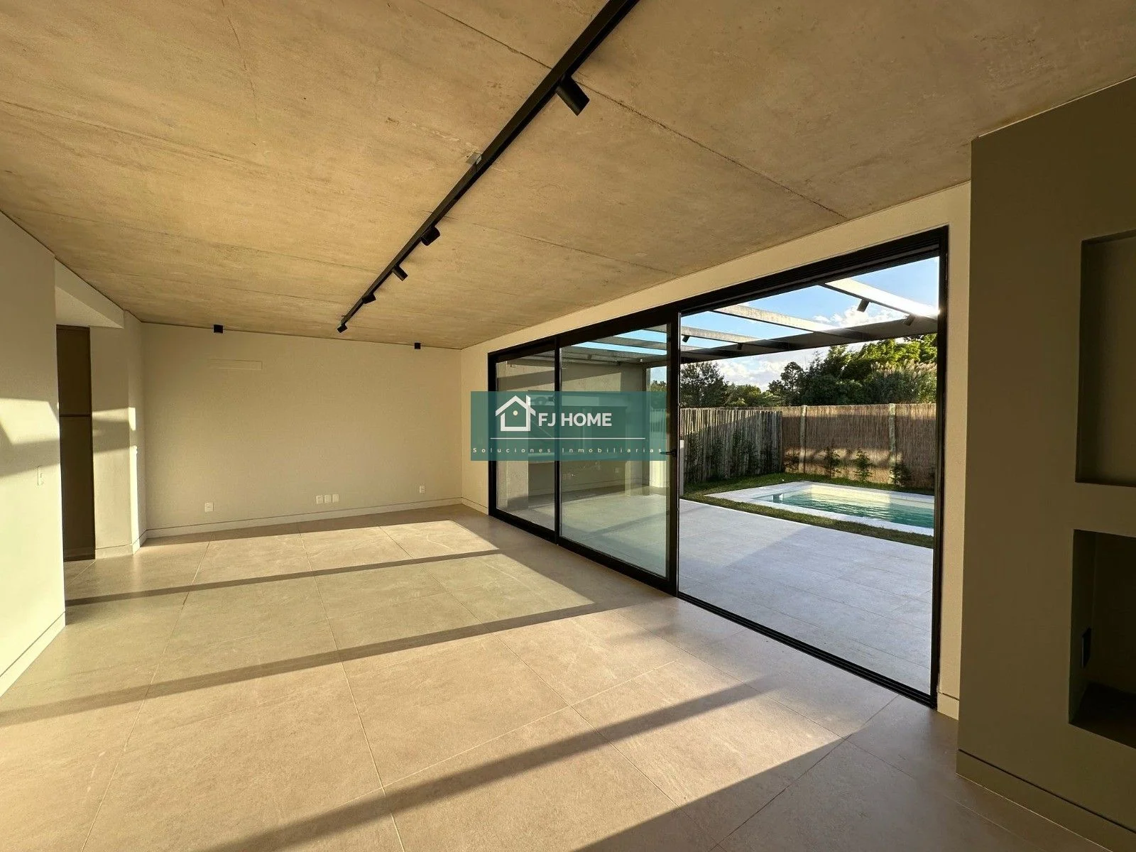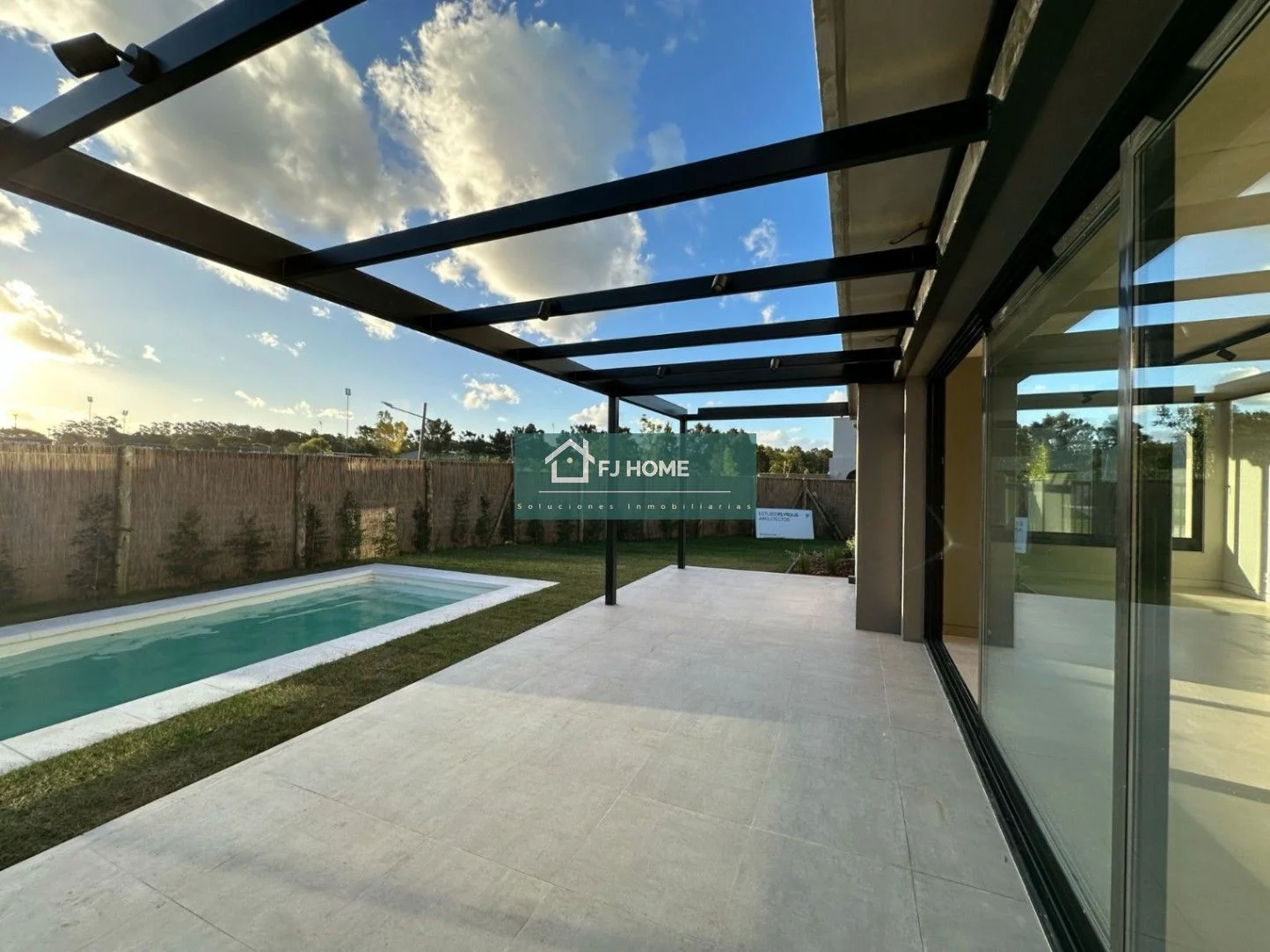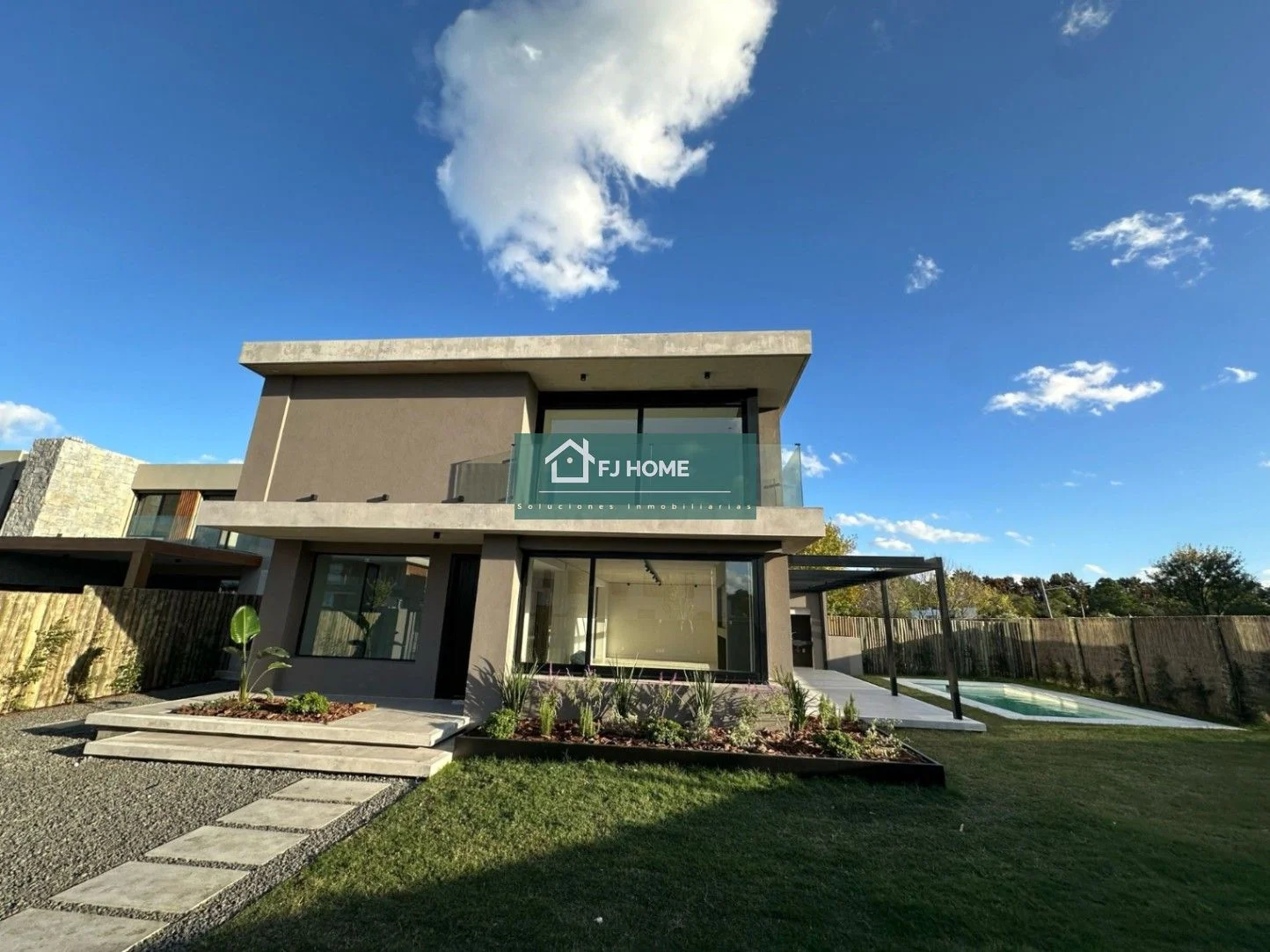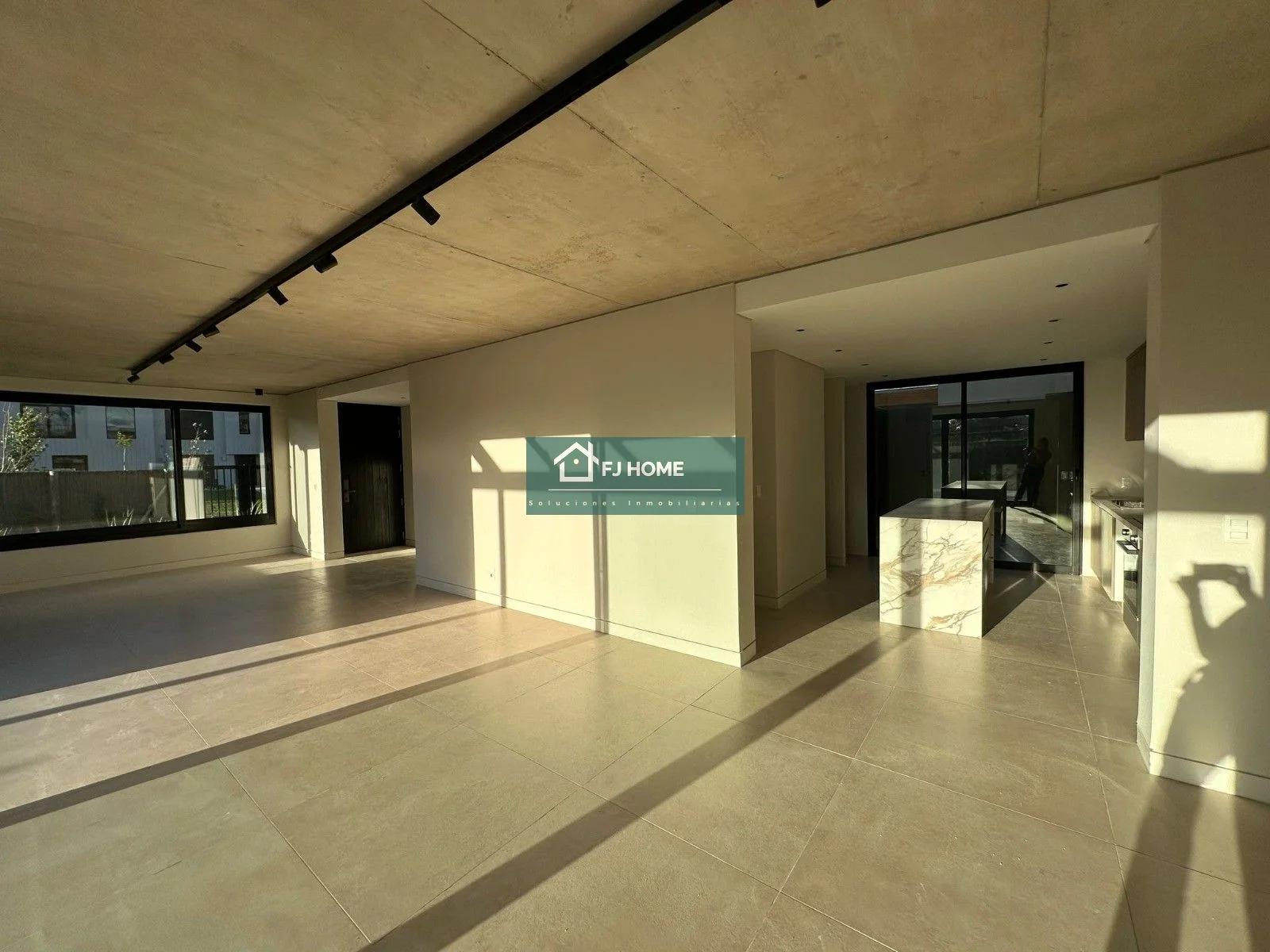 En la planta baja, se encuentra una moderna cocina integrada con isla, un sector de servicios, un playroom o escritorio independiente, y un baño social. El amplio estar y el living comedor están diseñados para integrarse con una pérgola semi techada y un jardín que incluye una piscina de gran tamaño, rodeada de un paisajismo terminado que realza la belleza del espacio exterior. Además, la propiedad dispone de cochera para tres autos, brindando comodidad y acceso directo.