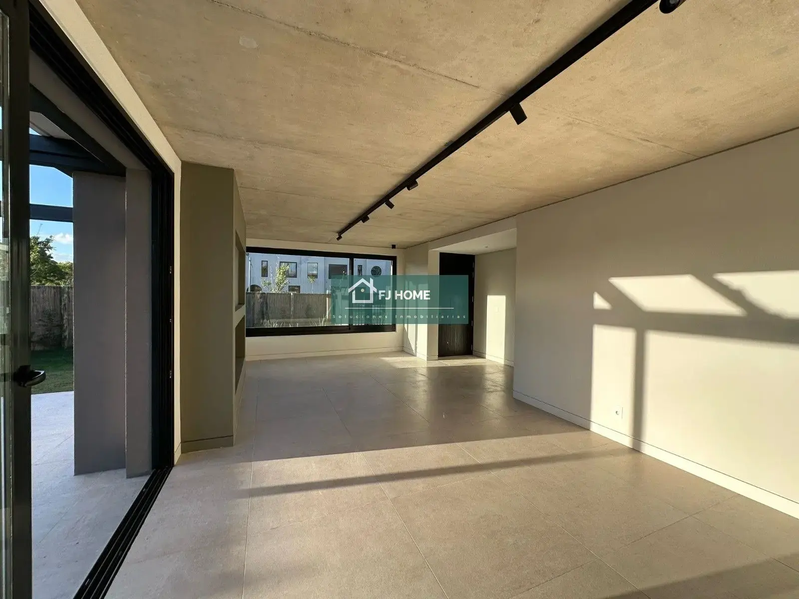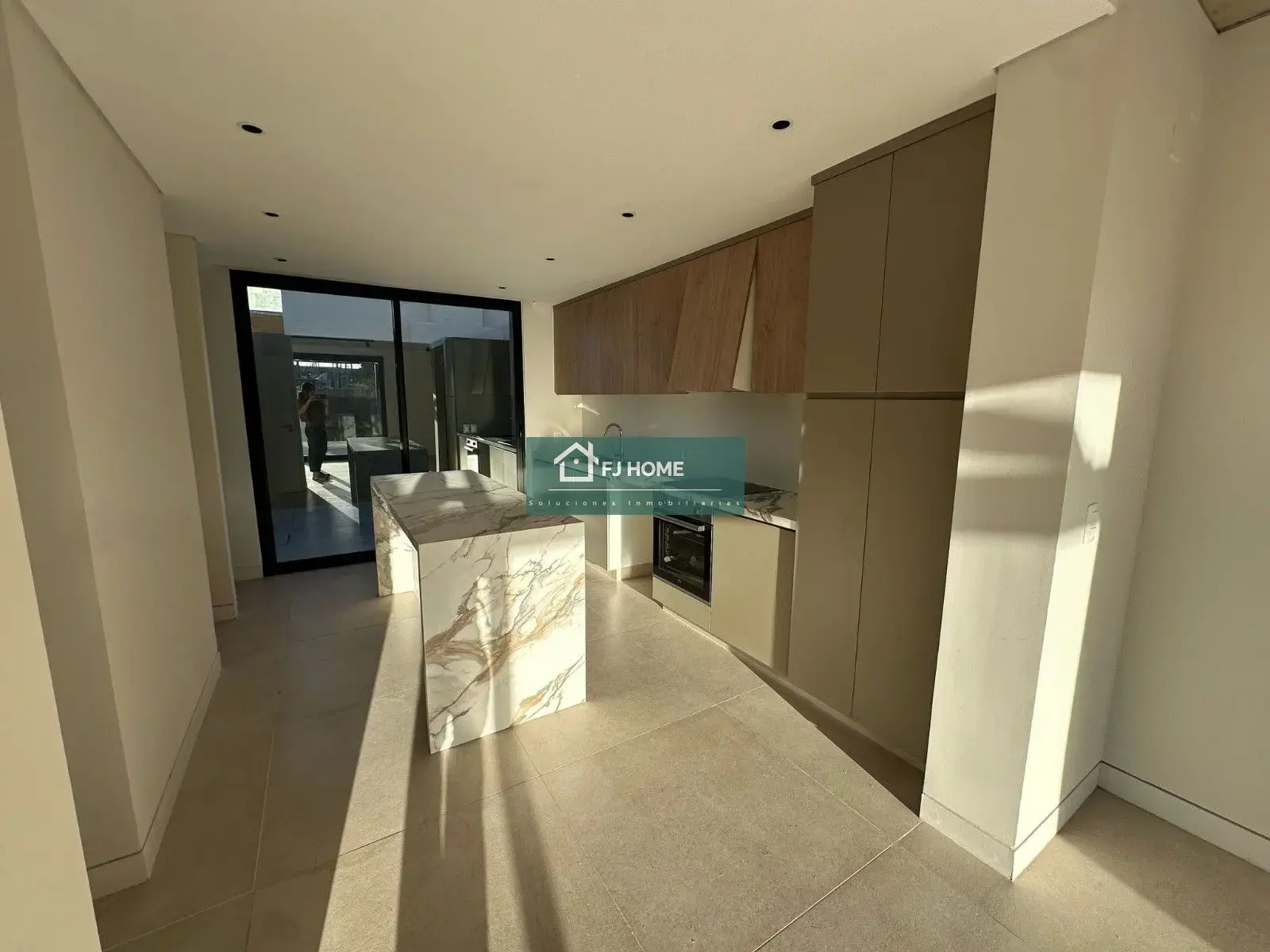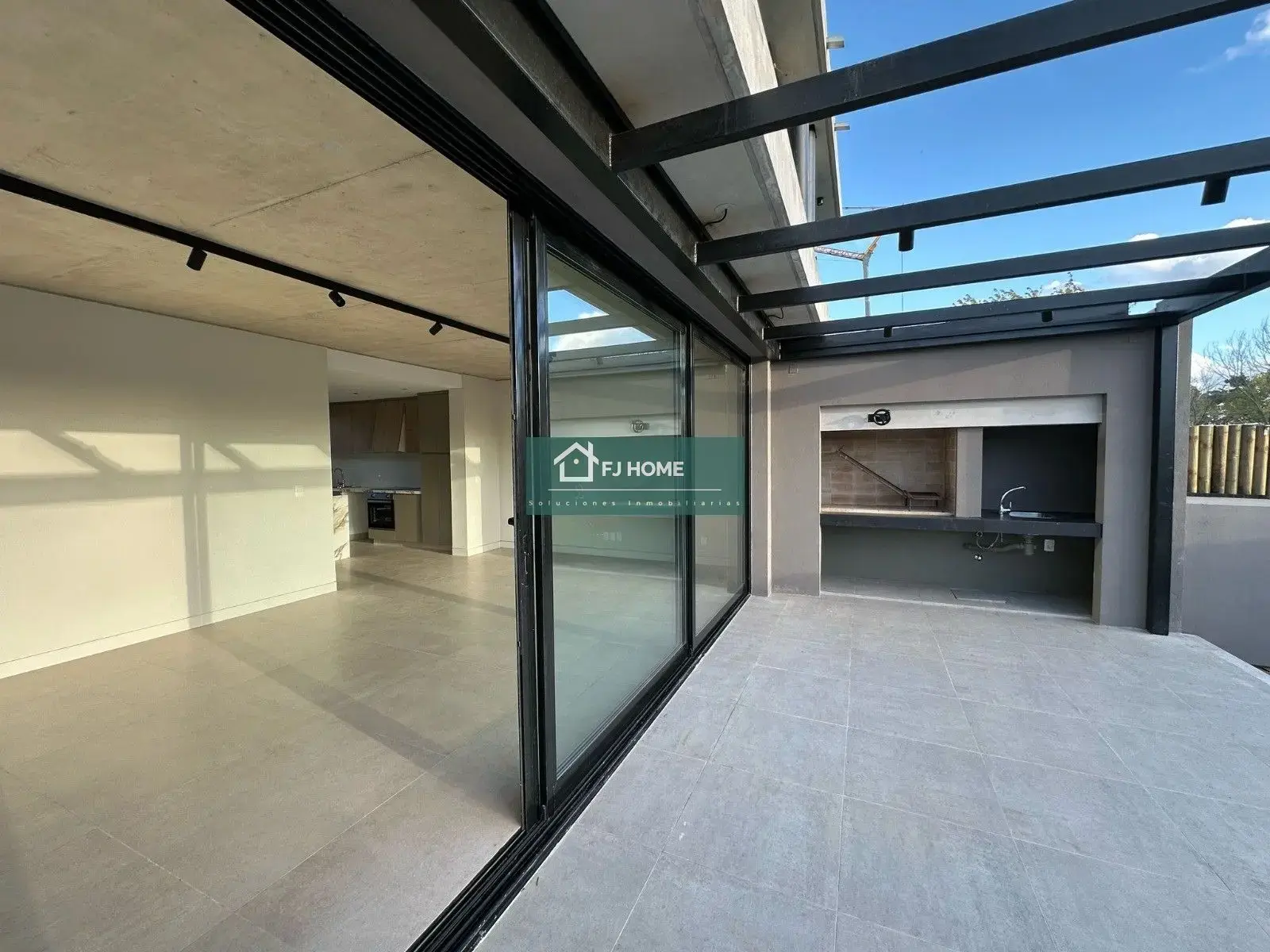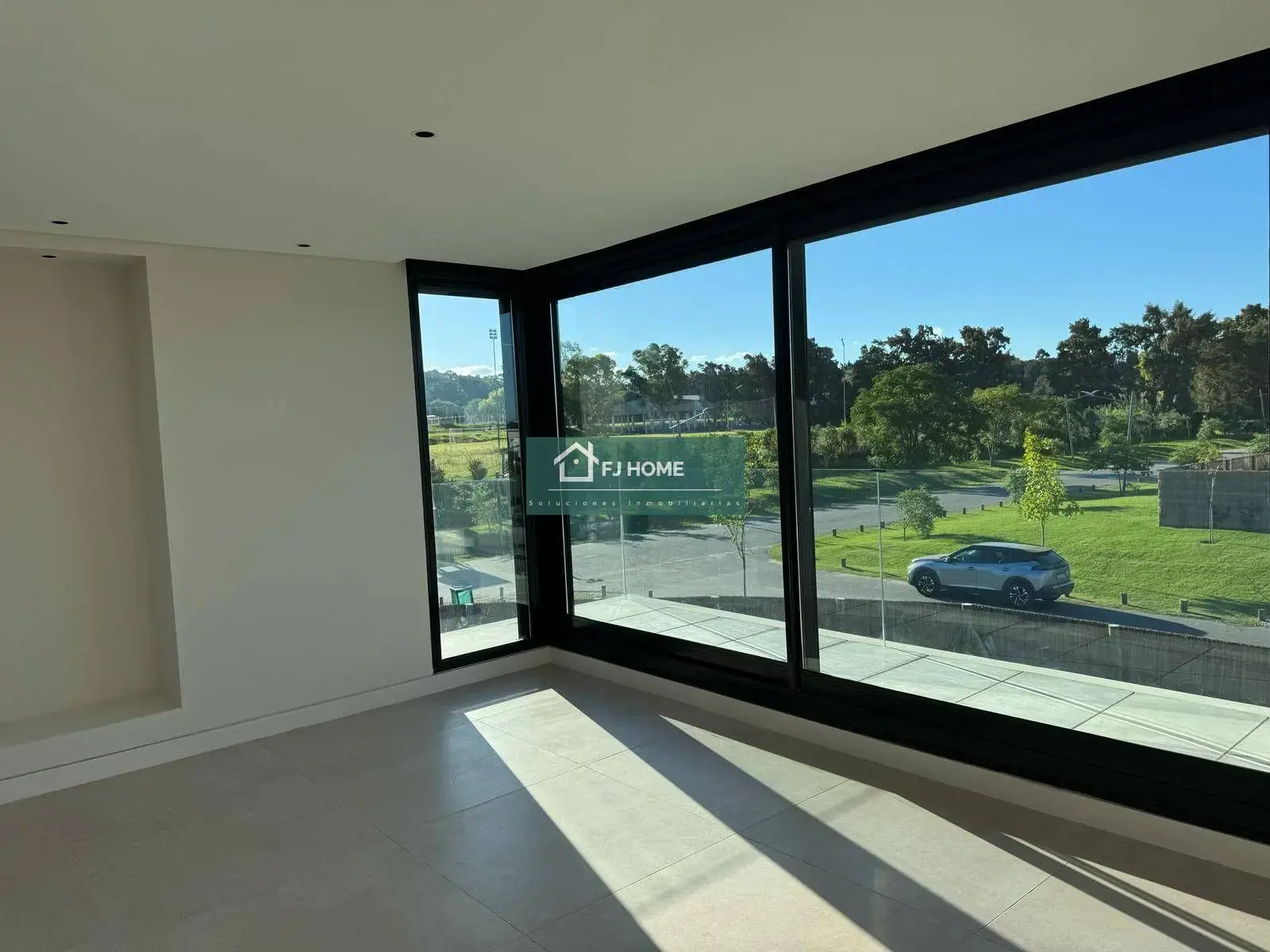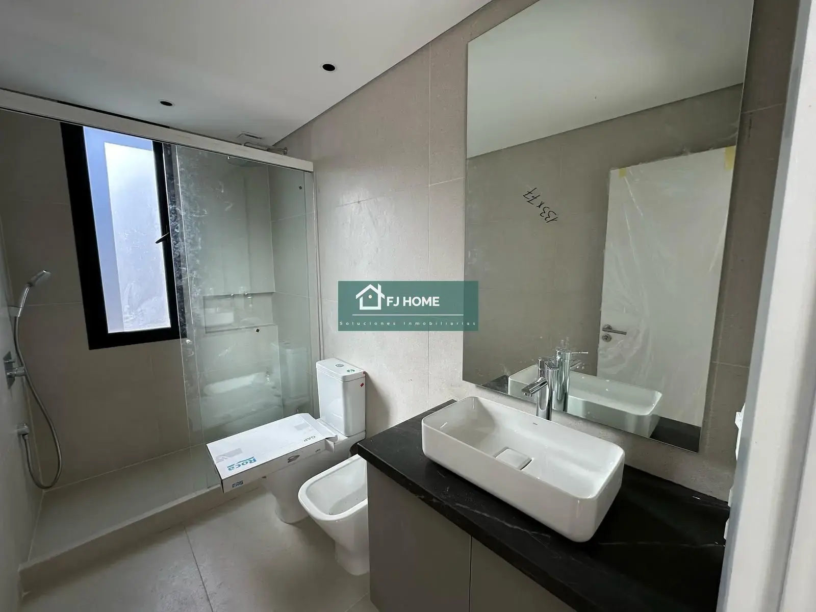 En la planta baja, se encuentra una moderna cocina integrada con isla, un sector de servicios, un playroom o escritorio independiente, y un baño social. El amplio estar y el living comedor están diseñados para integrarse con una pérgola semi techada y un jardín que incluye una piscina de gran tamaño, rodeada de un paisajismo terminado que realza la belleza del espacio exterior. Además, la propiedad dispone de cochera para tres autos, brindando comodidad y acceso directo.