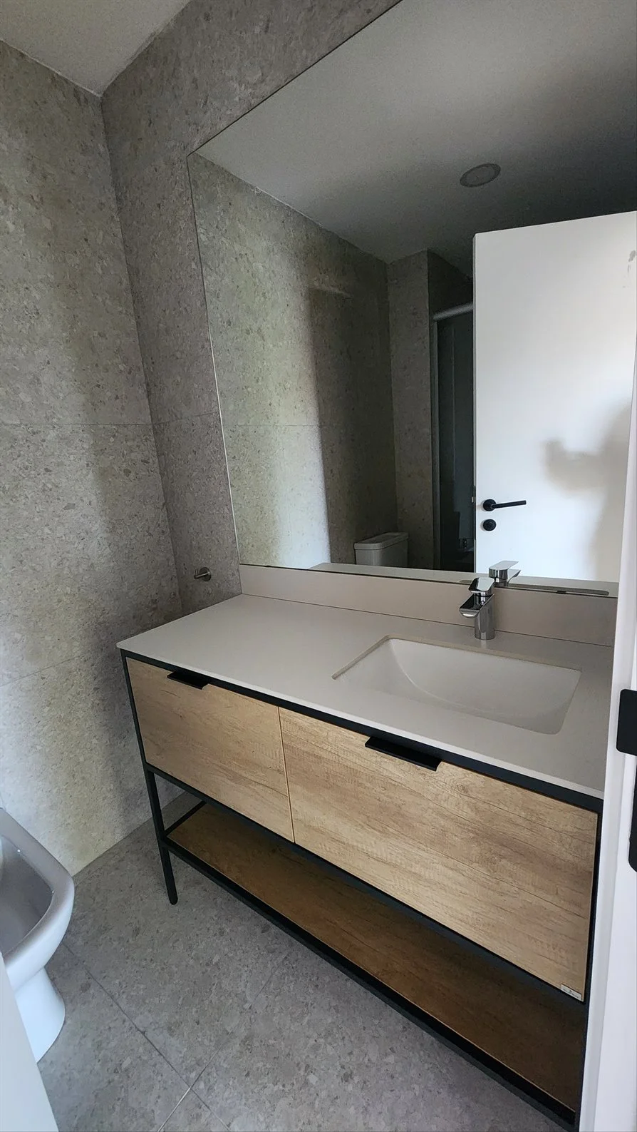 Cocina semi integrada con salida al jardín. Cuenta con horno, anafe y campana. Placard de almacenamiento y despojador.
