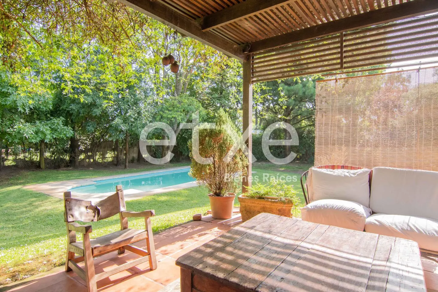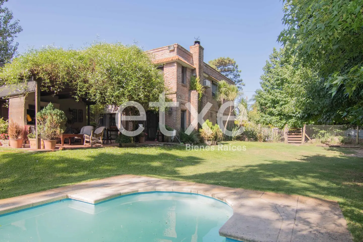 Precioso jardín de gran tamaño con piscina, parrillero techado, estar, baño y depósito.