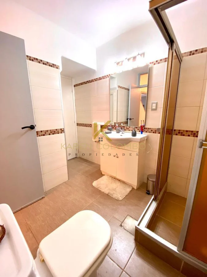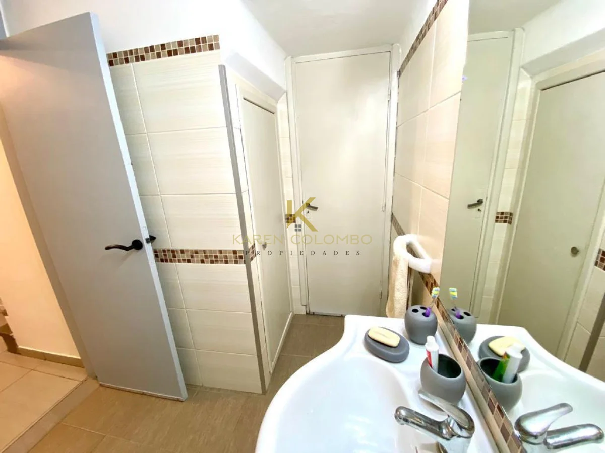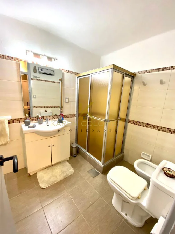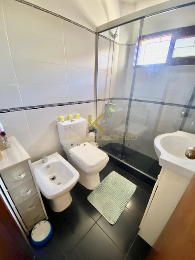 El baño principal posee doble circulación, mampara y un practico mueble de guardado.
