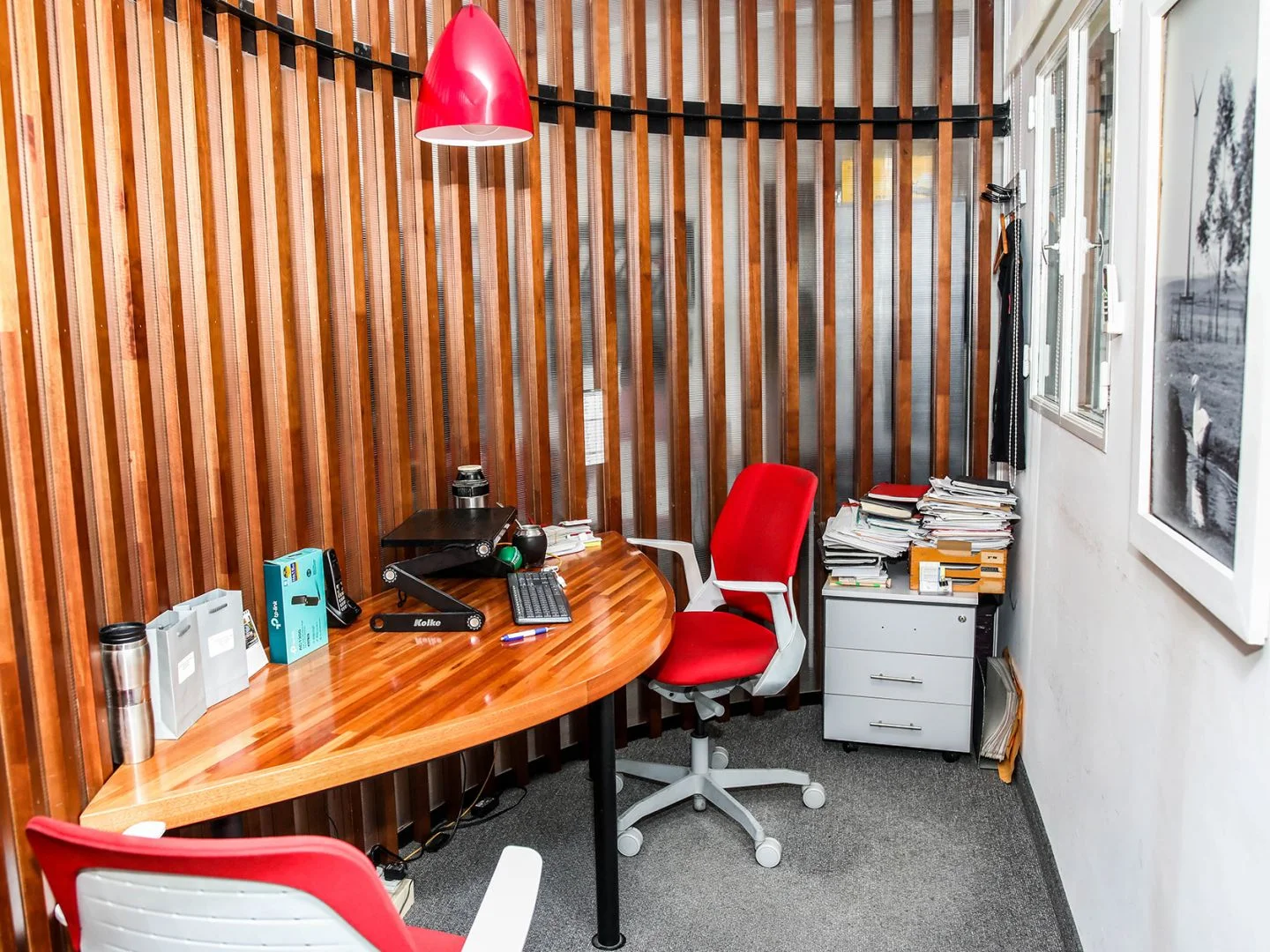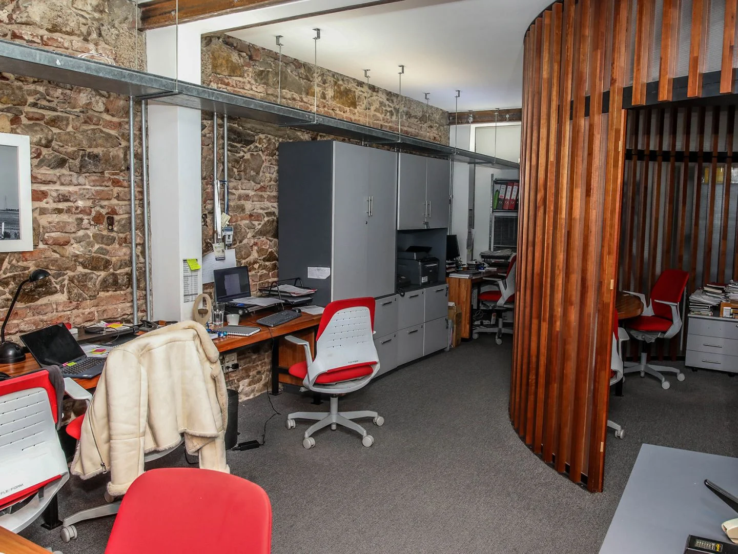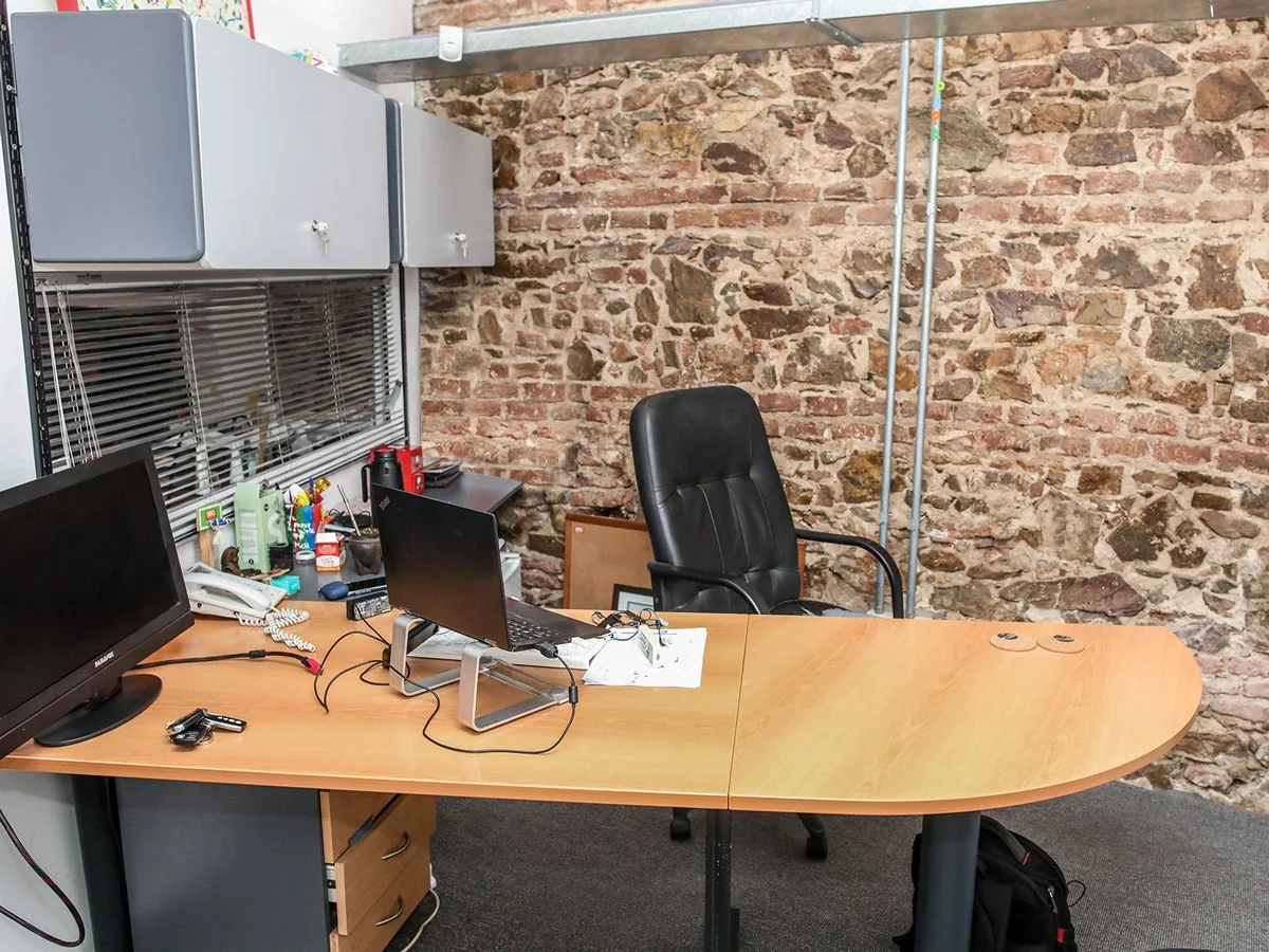 Desarrollada en 2 plantas. En planta baja recepción, sala de reuniones, open office, 1 oficina pequeña, amplia cocina, baño y patio con parrillero y barbacoa cerrada. En planta alta open office, 2 oficinas, baño completo y amplia terraza. Garaje para un auto.