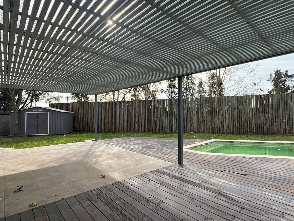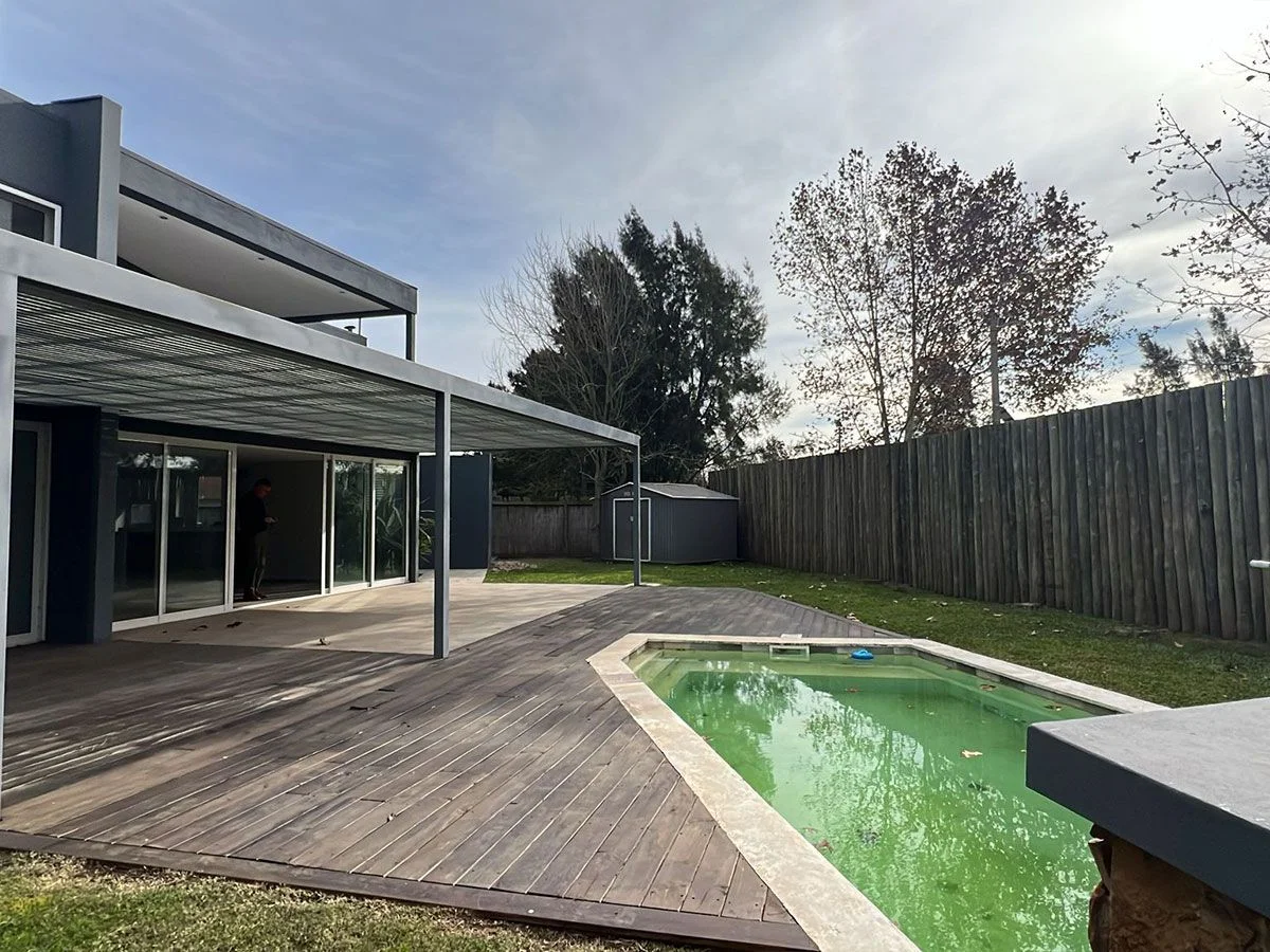 Exterior: Jardín con piscina, deck y parrillero. Lavadero con baño. Depósito. Cochera para 5 vehículos.