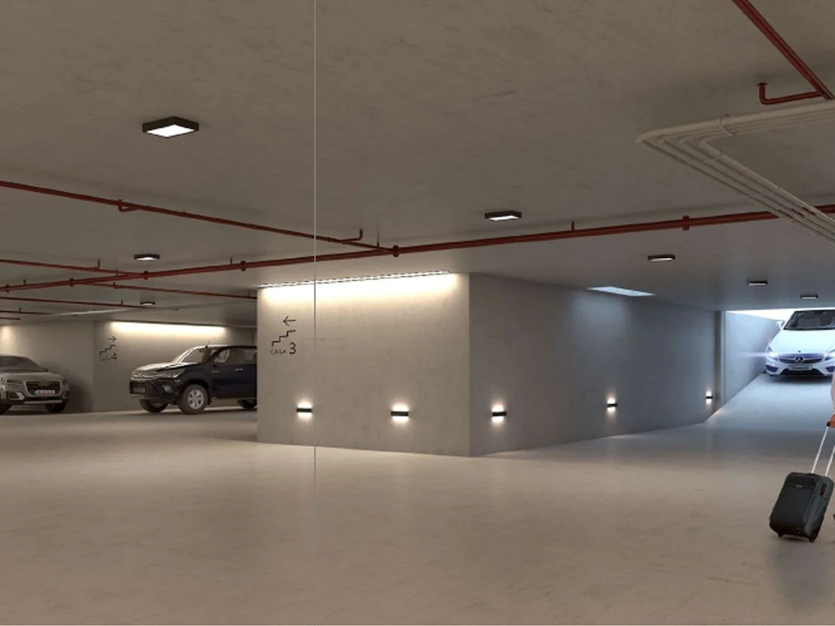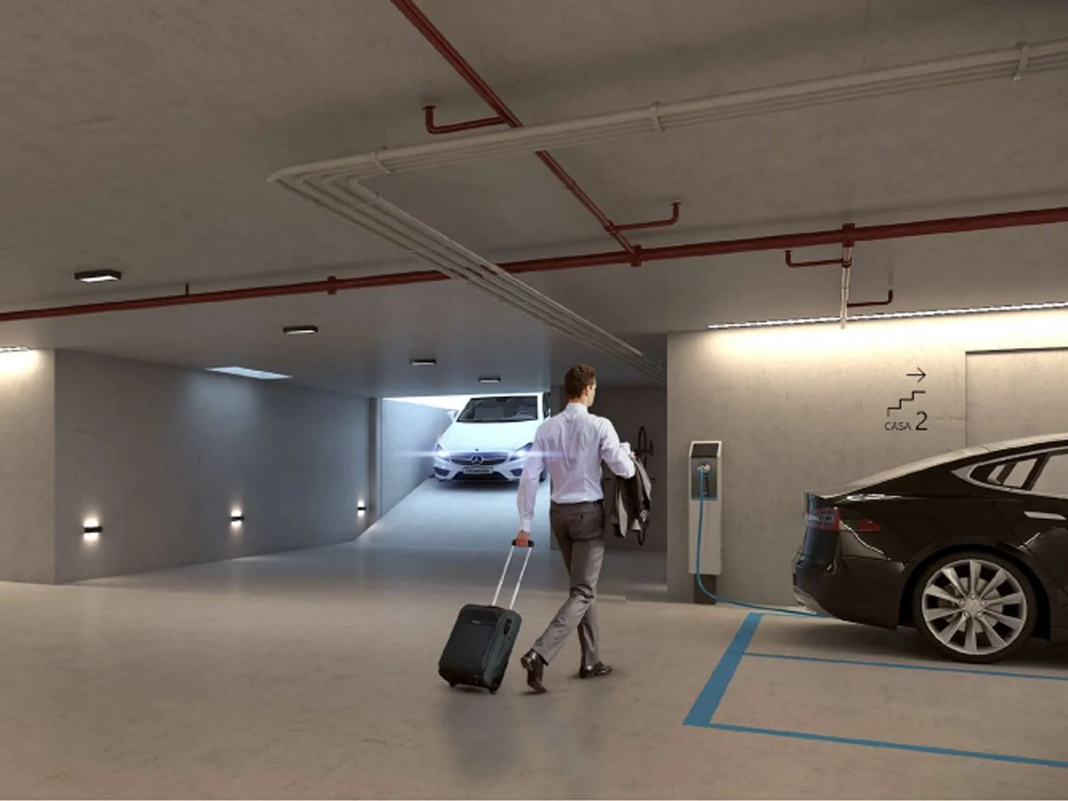 Estaciones de carga para autos eléctricos, bauleras individuales y espacio para bicis.