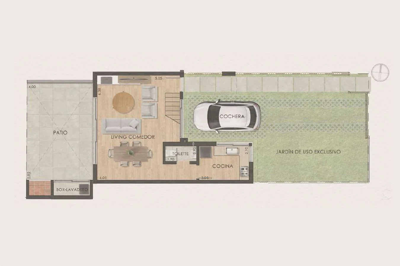 113m² interiores (46,8m² P.B. + 62m² P.A. + 4,2m² box y parrillero) + 86,5m² exteriores (14m² porche + 23,6m² patio + 48,9m² jardín).