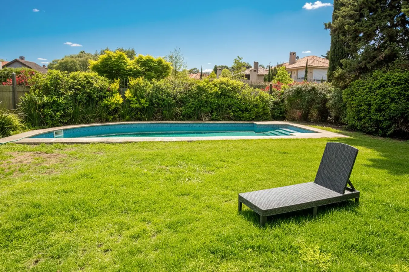 Gran barbacoa con estufa a leña, parrillero y barra, integrada a la casa y con acceso al jardín. Amplio jardín con galería, piscina y parrillero techado.