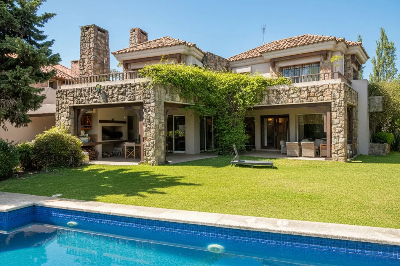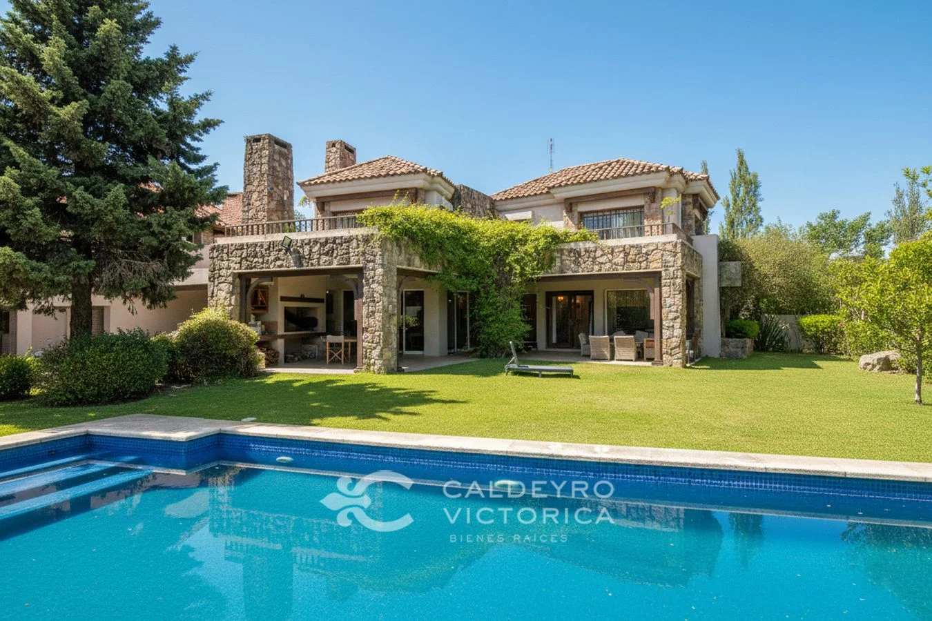 Desarrollada en dos plantas. En PB amplio hall de acceso con arcada, luminoso living comedor con vista y salida al jardín, estar comedor con importante estufa a leña en piedra, cocina definida con comedor diario, dos toilettes y lavadero. En PA cuatro dormitorios en suite con terraza. Vestidor. Pisos en lapacho y piedra laja. Paredes en piedra.