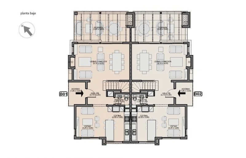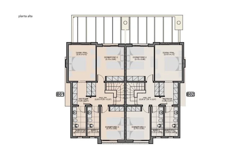 En planta alta, 3 dormitorios y dos baños completos. Principal en suite con vestidor.