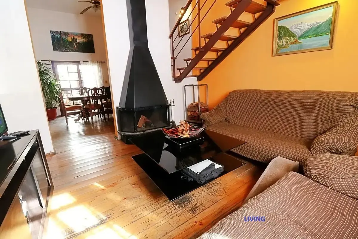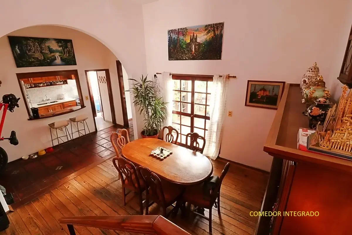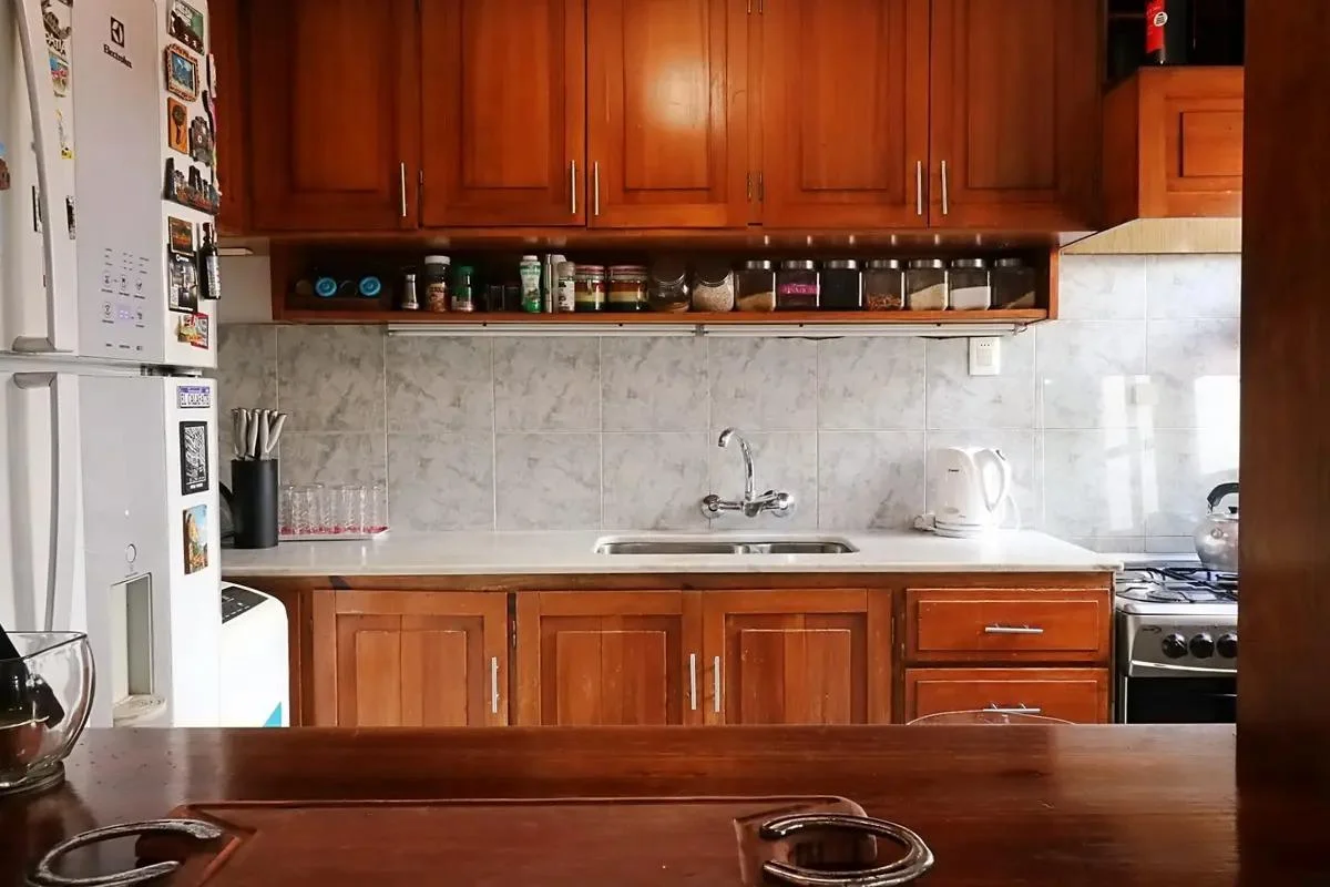 La cocina es amplia y funcional, con placares sobre y bajo mesada, y un pasaplatos que conecta con el comedor. Este espacio, de 4 metros por 4 metros, comparte las mismas dimensiones que el living, que además cuenta con una acogedora estufa a leña y pisos de pino plastificados. La luz natural baña todas las habitaciones de la casa, gracias a su orientación al norte.