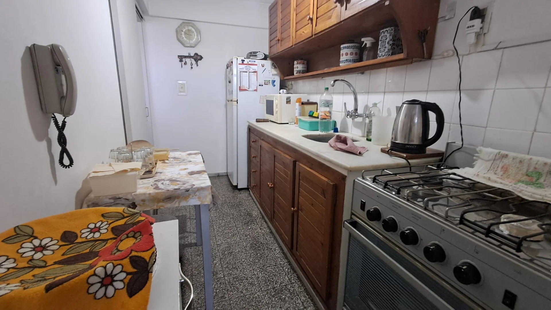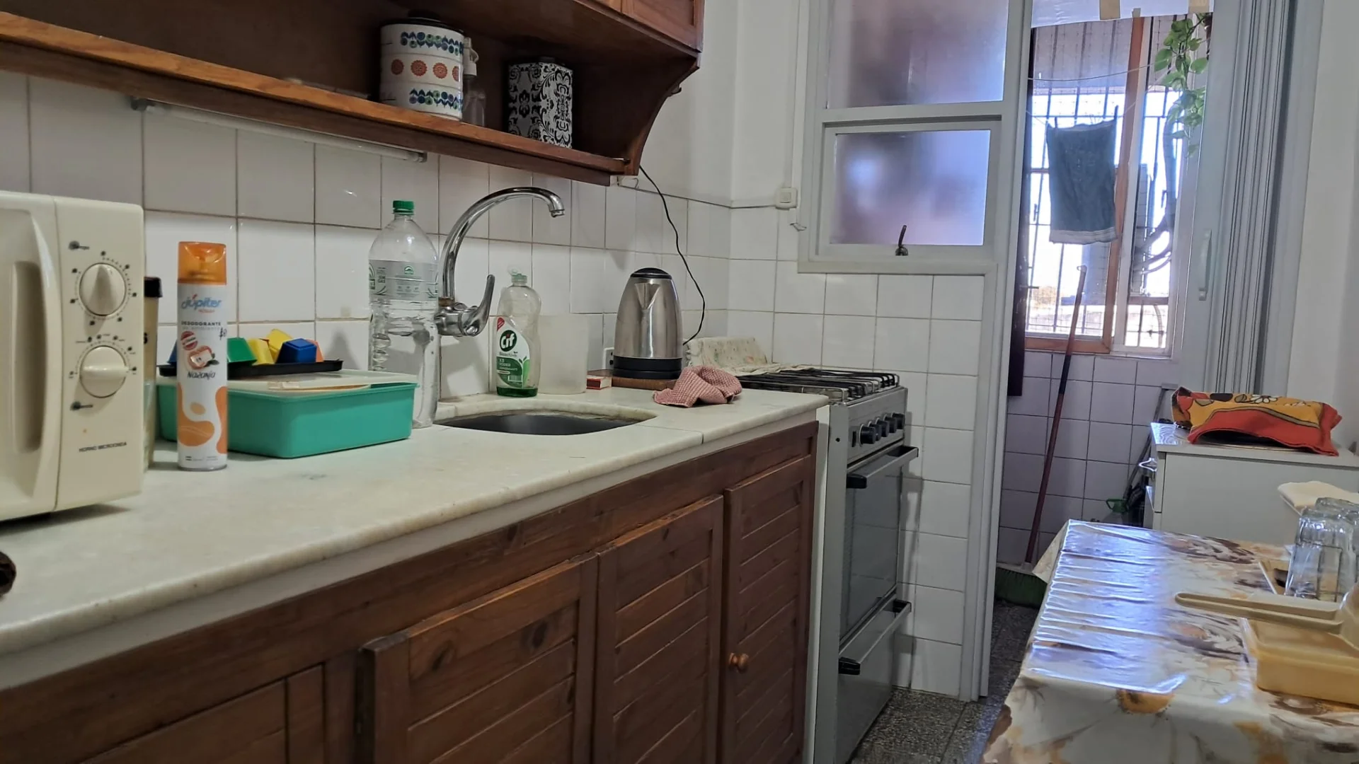 Cocina con mesada de mármol, muebles sobre y bajo mesada en madera y terraza lavadero al frente con lavarropas instalado.