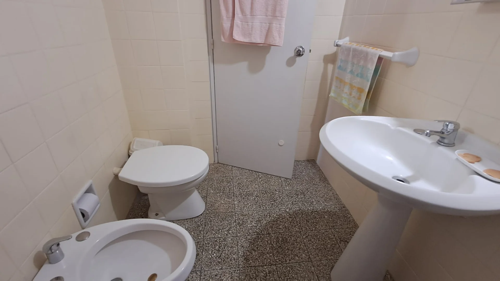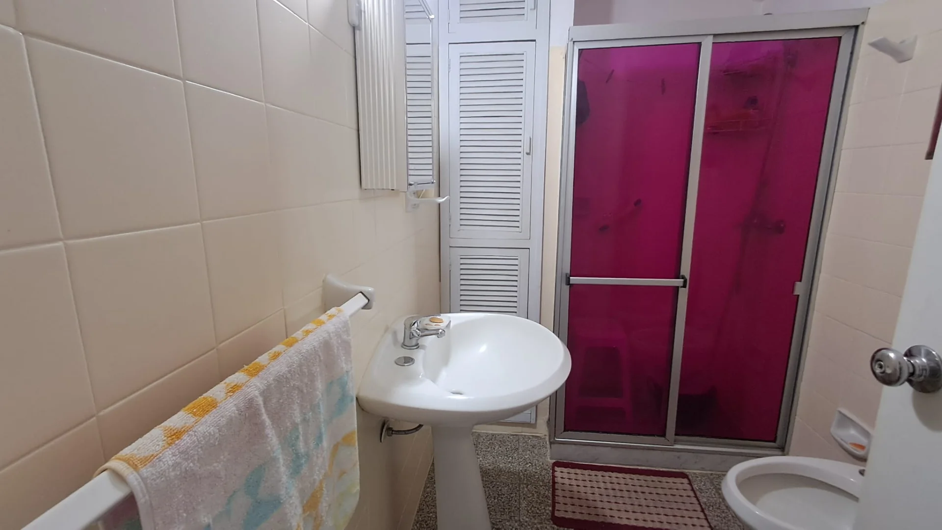 Baño completo de buen tamaño, duchero con mampara acrílica y placard.