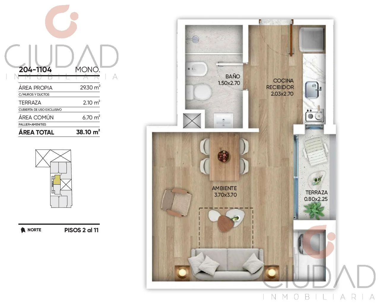 Unidad funcional con terraza, kitchenette, espacio de lavadero con conexión para lavarropas y baño completo.