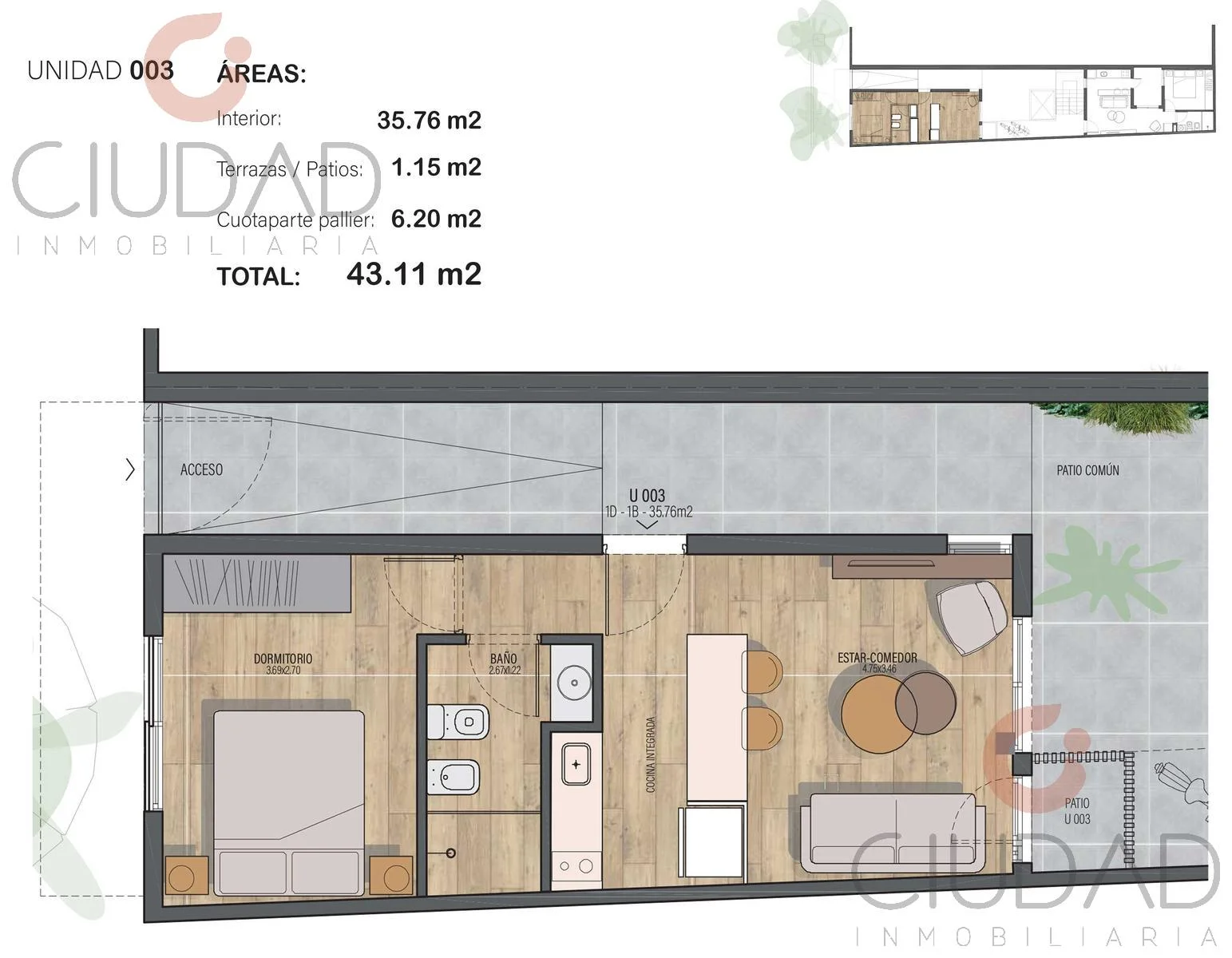 Unidad ubicada en PB al frente, la cual consta de 1 Dormitorio, living comedor con cocina integrada (Horno y Anafe incluidos) con isla y baño completo. Además cuenta con acceso directo a patio central de uso común.
