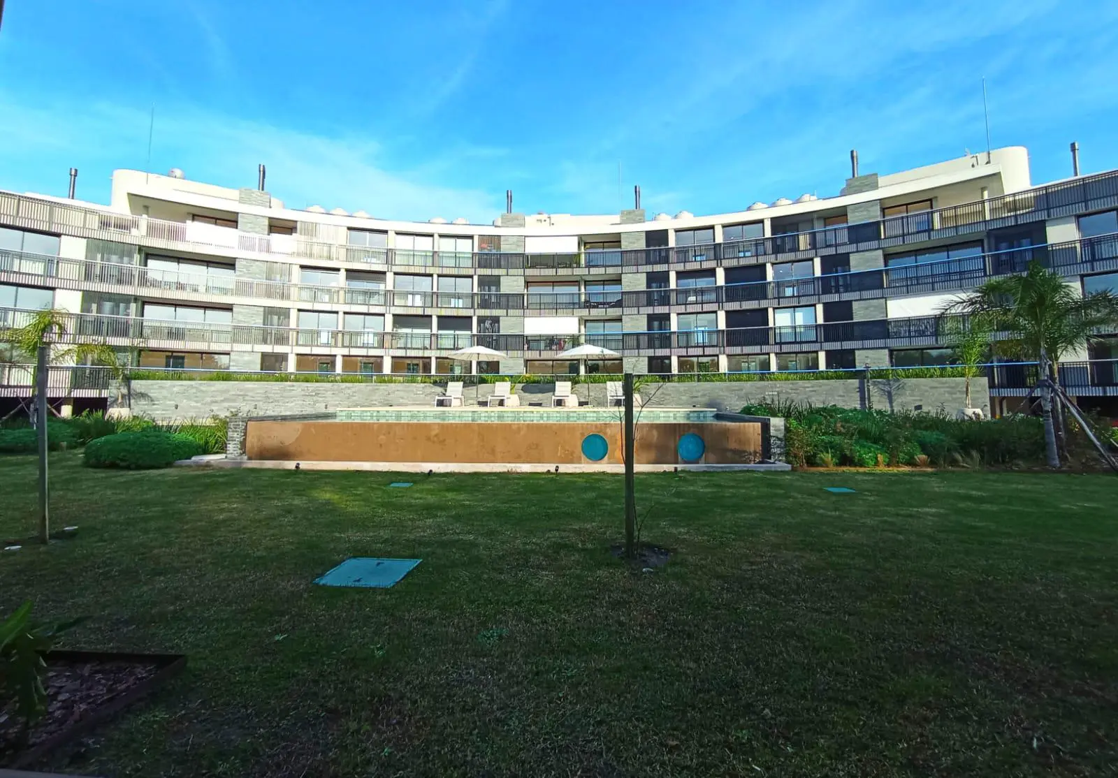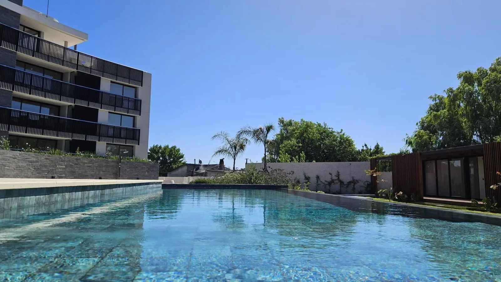 - Piscina de diseño con borde infinito, climatizada con agua salada y amplio solarium con deck atérmico