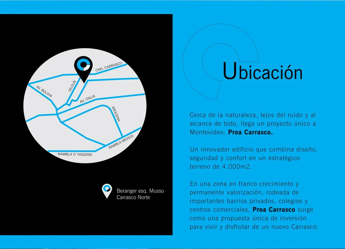 En una zona en franco crecimiento y permanente valorización, rodeada de importantes barrios privados, colegios y centros comerciales, Proa Carrasco surge como una propuesta única de inversión para vivir y disfrutar de un nuevo Carrasco.