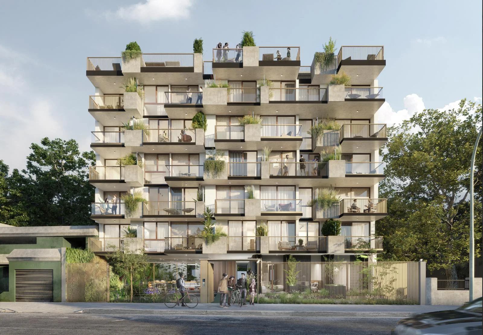 Subsuelo con cocheras opcional a 20.000 dólares y bike parking para todos los apartamentos. El ingreso al edificio en planta baja se caracteriza por tener un camino singular con espacios de bike parking y postas verdes que serán espacios destinados para estar, disfrutar, leer o trabajar. Además, el hall del edificio posee un área de cowork interior.