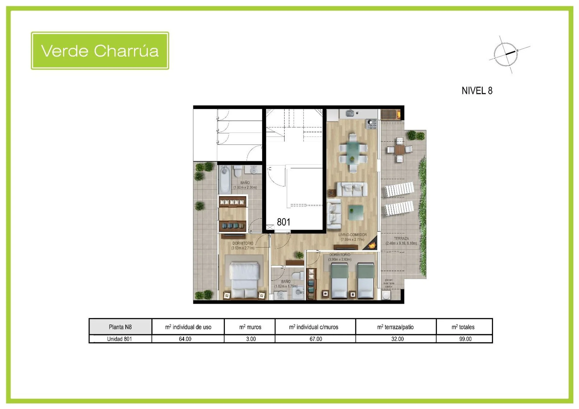 Unidad 105 U$S 122.500 metraje conformado de la siguiente manera (42,7 m2, 4,45 m2 muros, 6,6 m2 terraza)