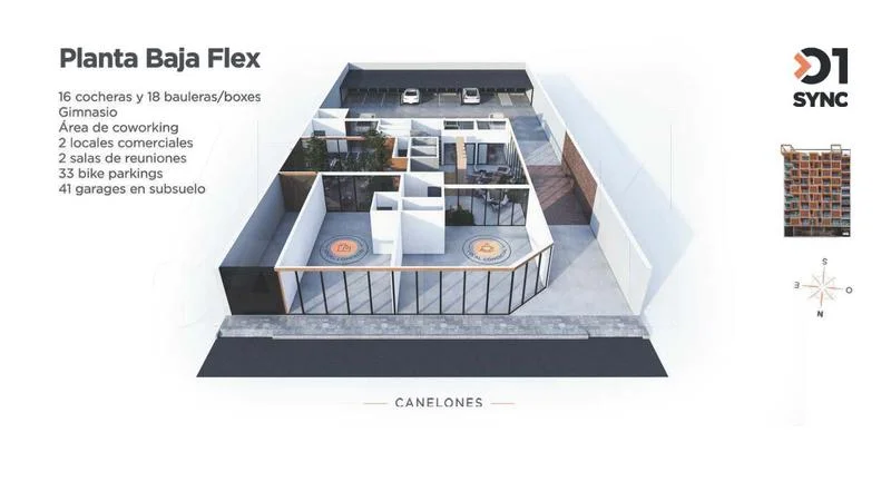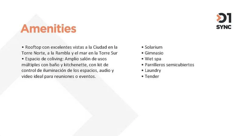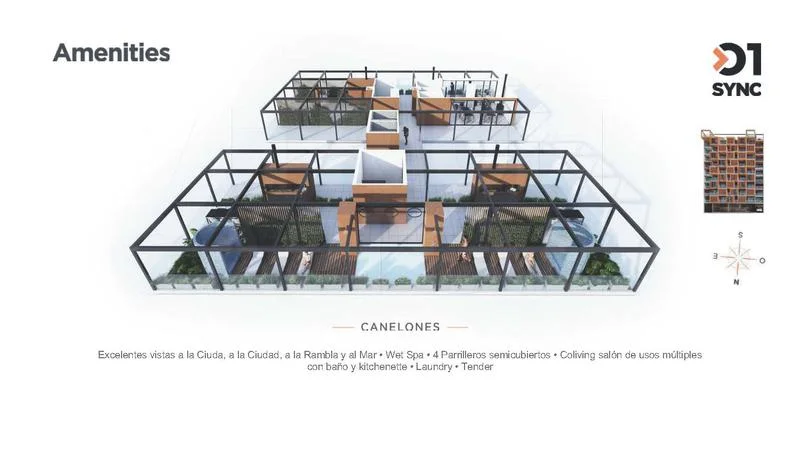 Y contará además con un hall de acceso flex que integra: locales comerciales, salas de reunión, gimnasio y patio interno. Y Rooftop con excelentes vistas a la Ciudad en la Torre Norte, a la Rambla y el mar en la Torre Sur.