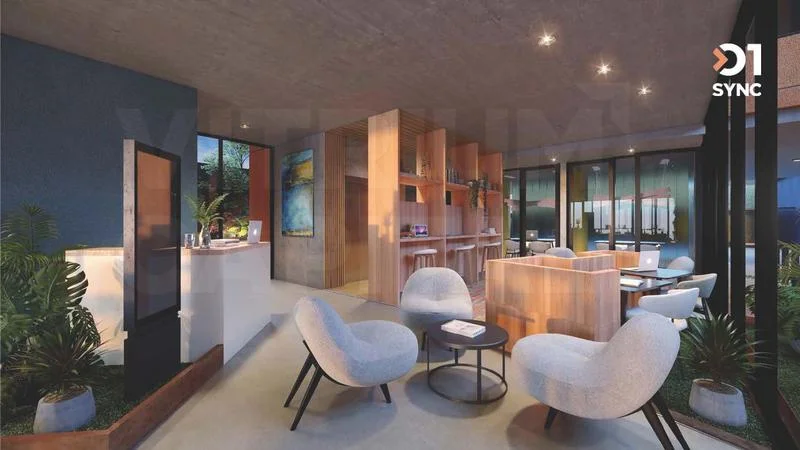 Espacio de coliving: Amplio salón de usos múltiples con baño y kitchenette, con kit de control de iluminación de los espacios, audio y video ideal para reuniones o eventos.