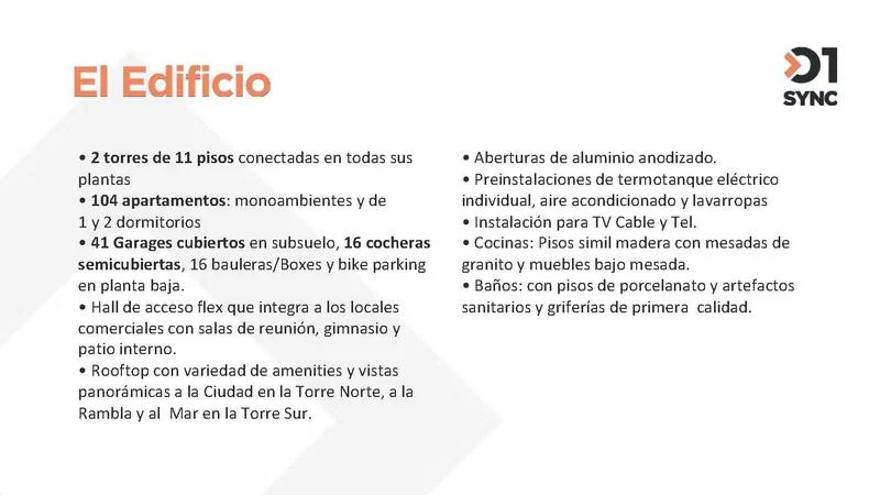 El proyecto consta de 2 torres de 11 pisos con orientación Norte y un total de 104 apartamentos, además garajes, cocheras y boxes en PB y SS.