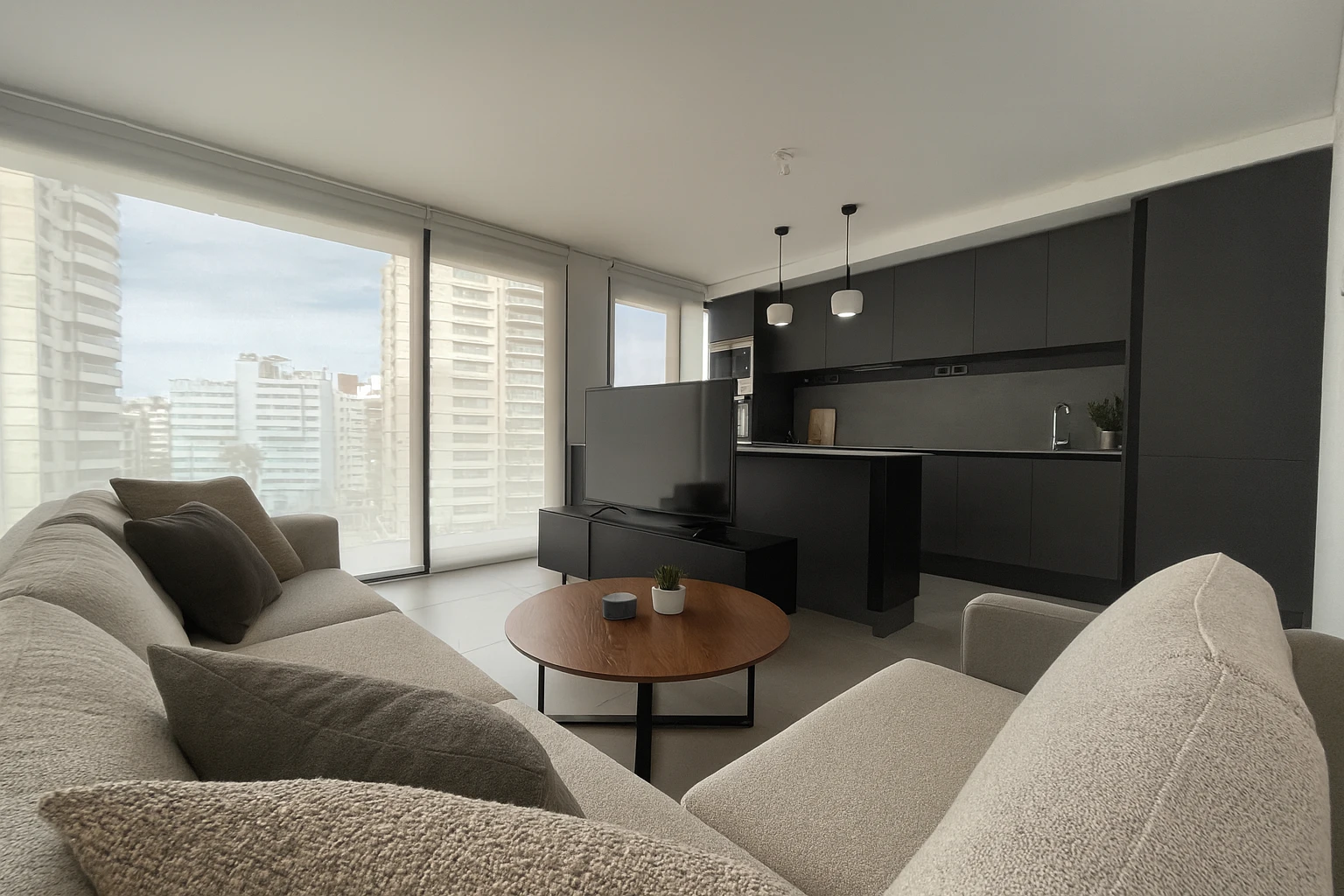 La unidad cuenta con 2 dormitorios, incluyendo suite principal, y 2 baños completos. Cada ambiente fue cuidadosamente diseñado para maximizar la luz natural y potenciar la sensación de amplitud, integrando un living comedor con cocina integrada con sistema de TV invisible y terraza al frente en todos los ambientes con la mejor orientación del edificio.