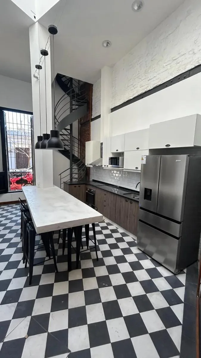 El área social se desarrolla en un acogedor patio colonial con cocina integrada, perfecto para reuniones sociales, encuentros profesionales o simplemente para disfrutar un momento de descanso en un entorno privado. Desde el patio se accede a la azotea mediante una escalera caracol de diseño exclusivo, que aporta un toque único a la casa. Además, la propiedad cuenta con lavadora para mayor comodidad en la vida diaria.