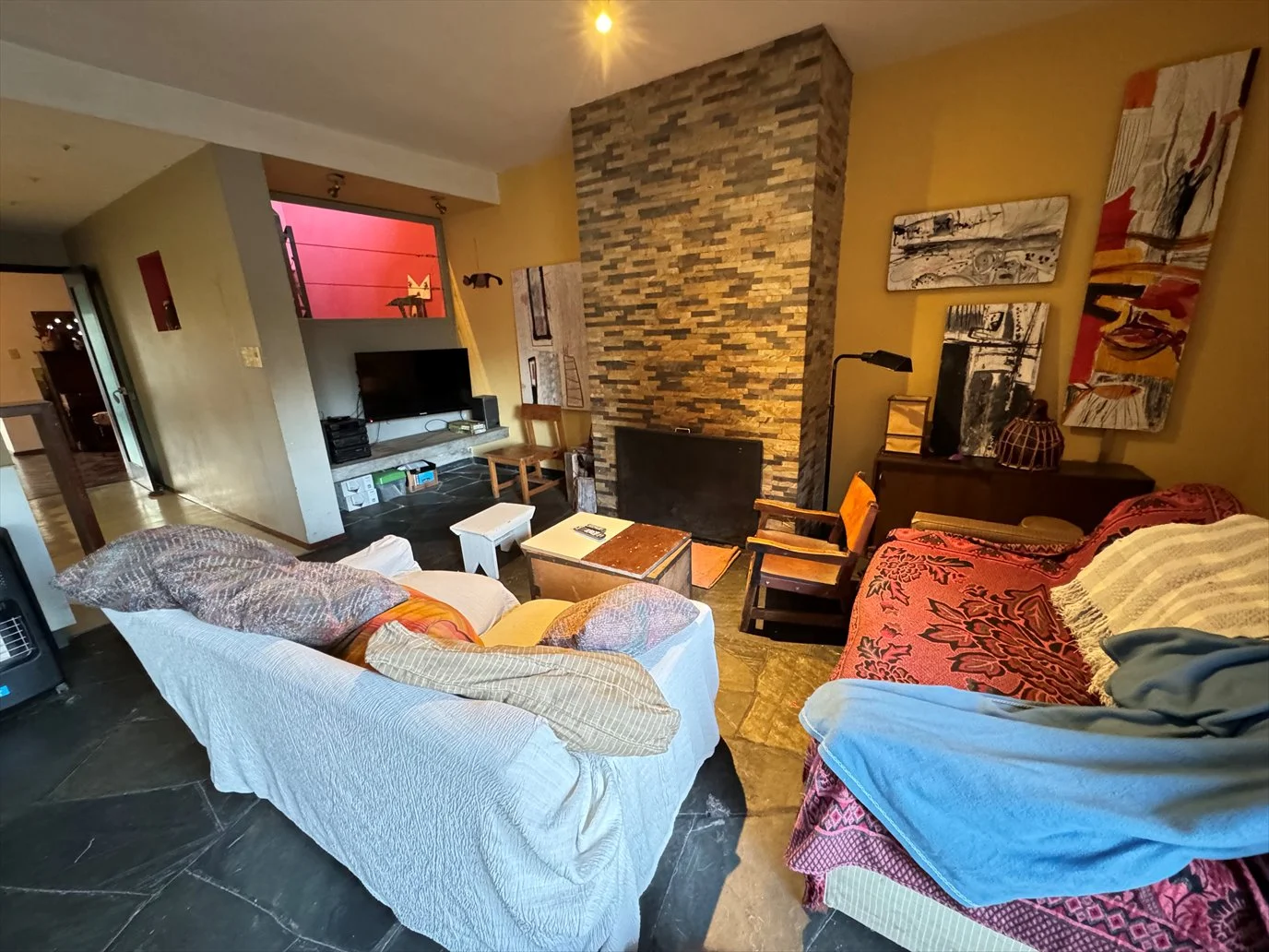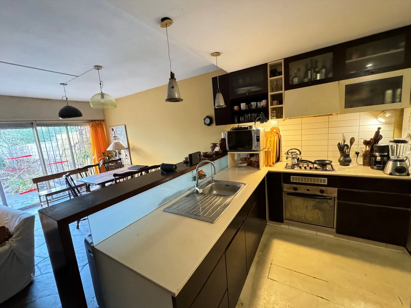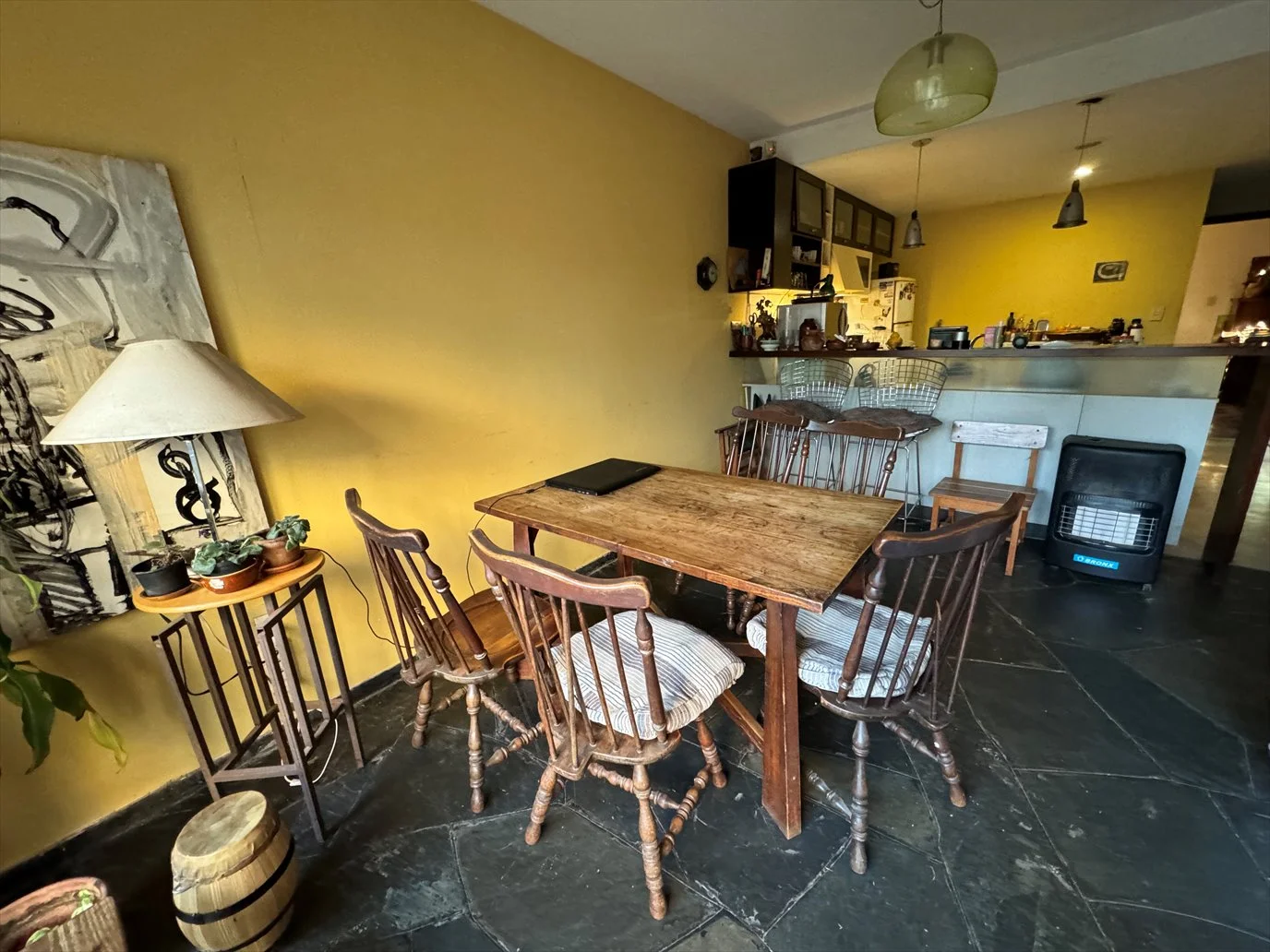 -Amplia sala de estar con estufa a leña . Cocina integrada reciclada.