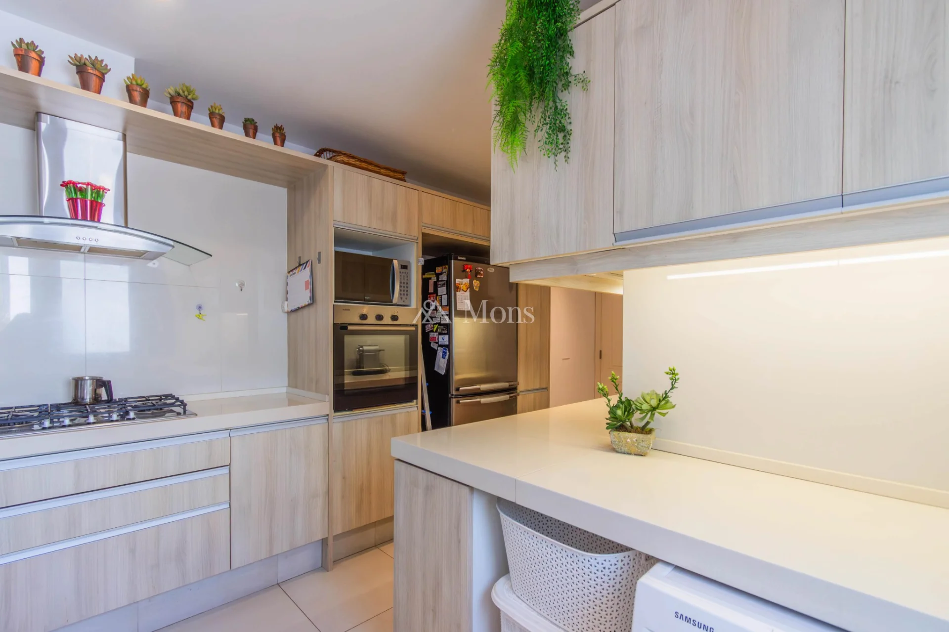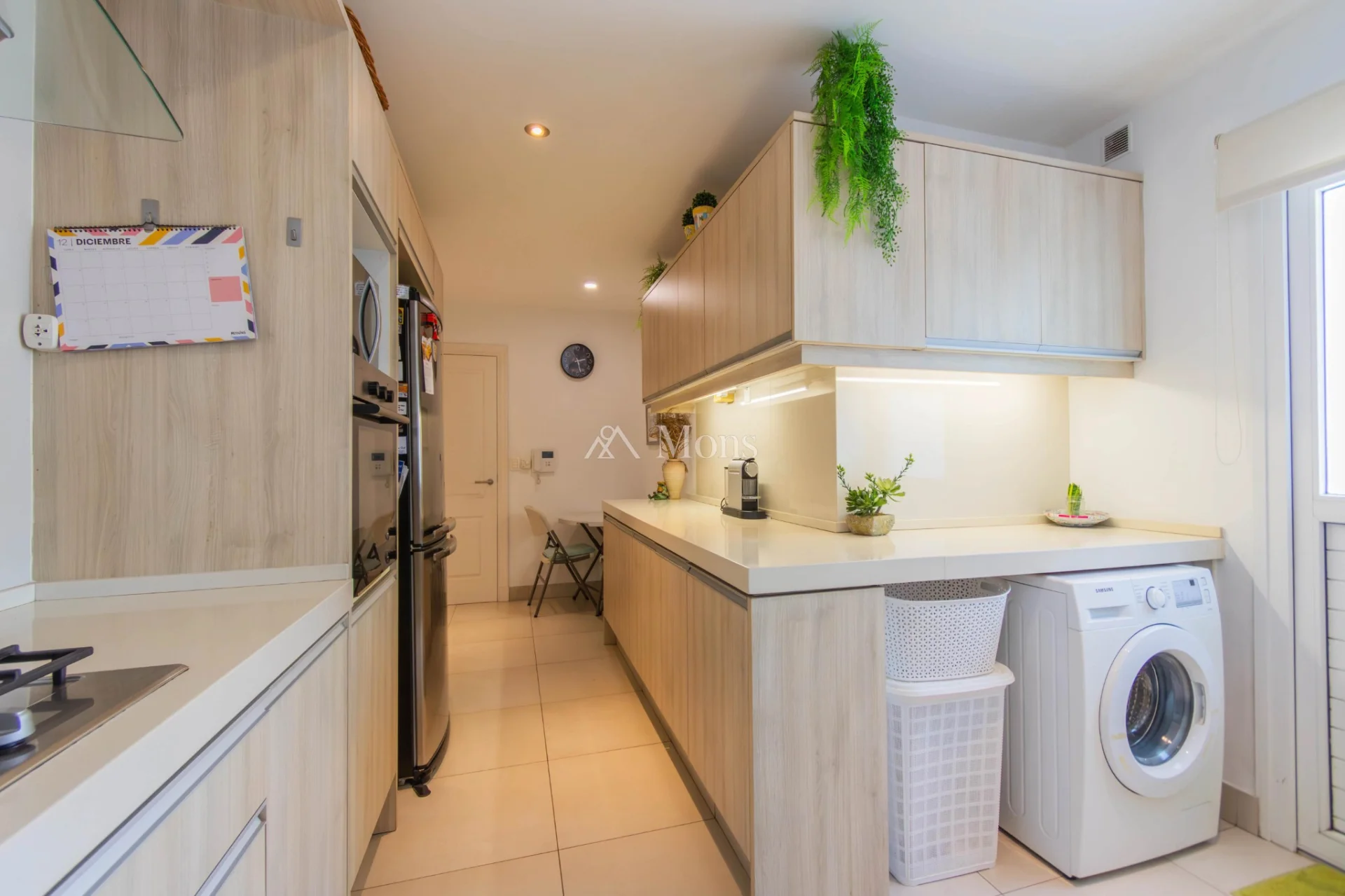 Se accede a la cocina, independiente del área social para mayor intimidad en el área social. Cocina amplia, con tres mesadas, terraza lavadero y lindera al área de servicio.