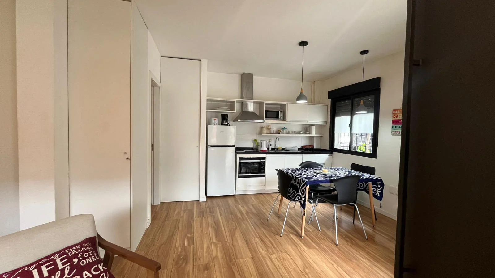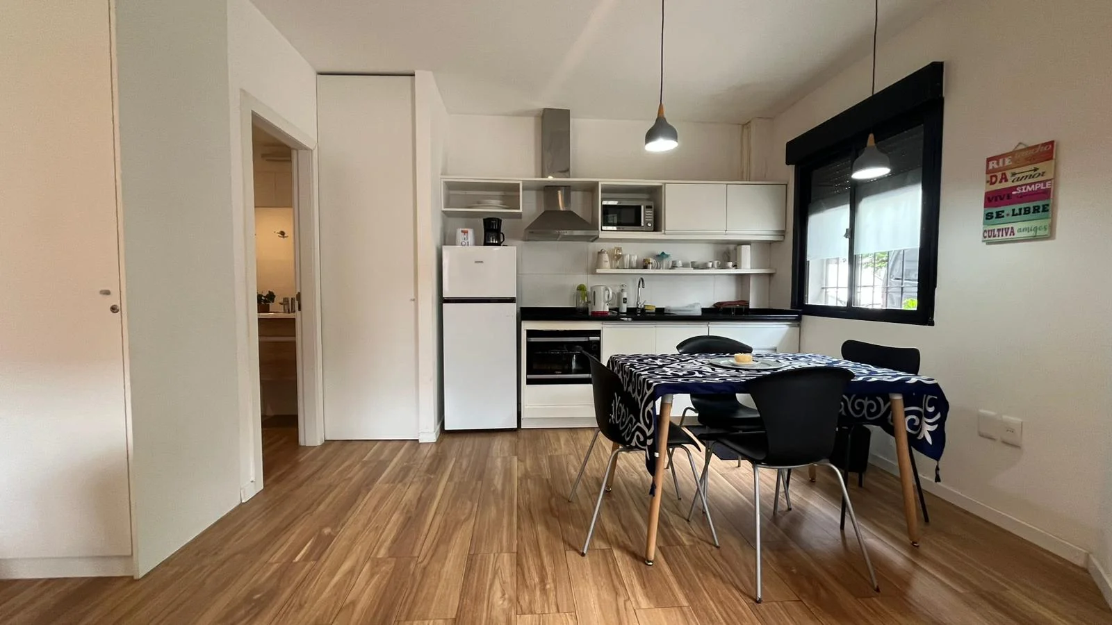Ingresando al ambiente encontramos una espaciosa cocina, equipada con: heladera, cocina, microondas, anafe, campana. Adicional juego de comedor.