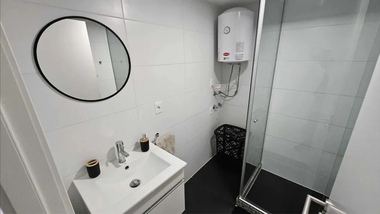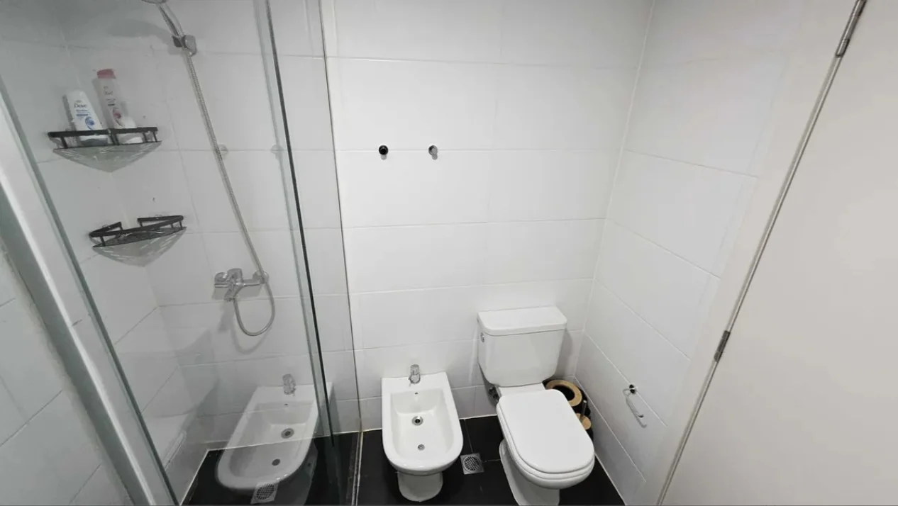 Baño completo con ducha y mampara de vidrio, conexión para lavarropas.