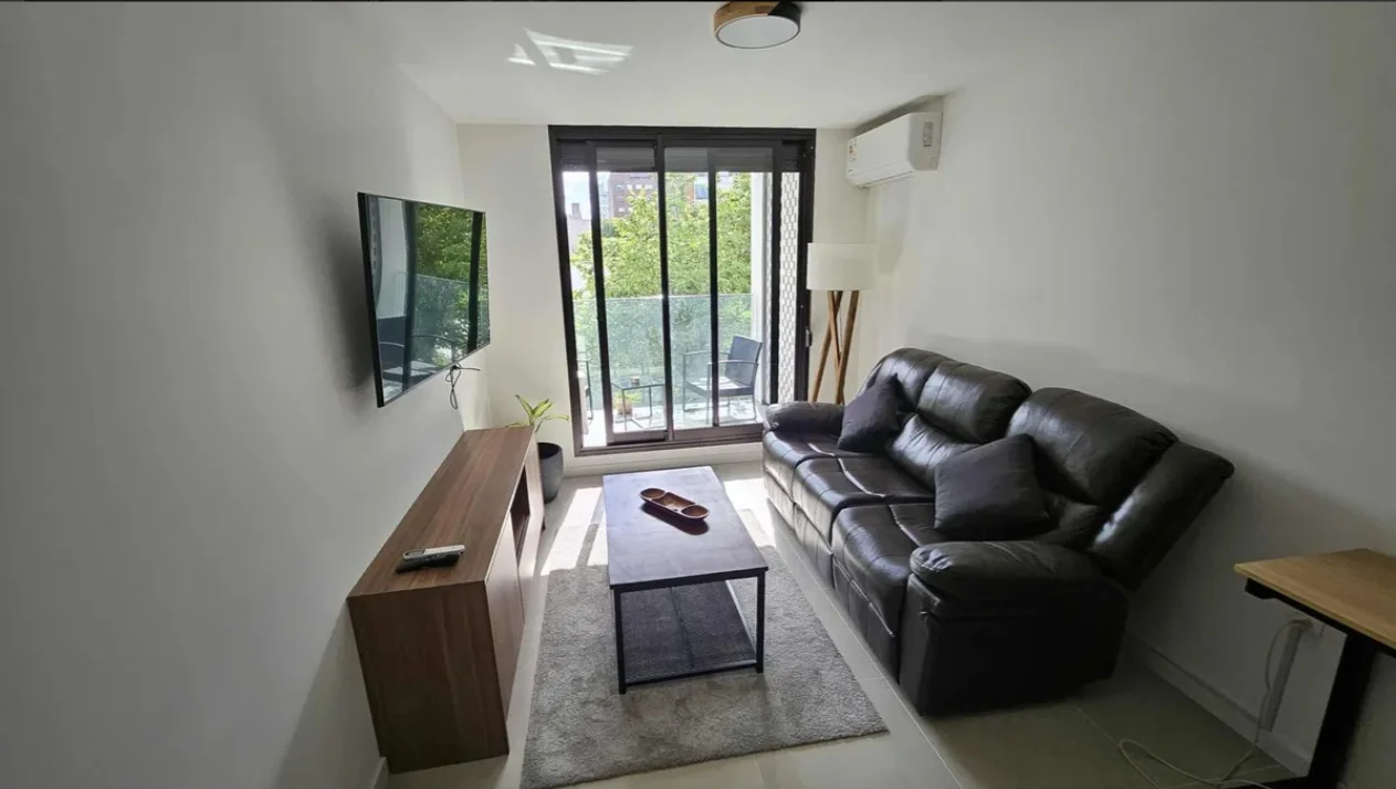Amplio living comedor con aire acondicionado y salida al balcón.