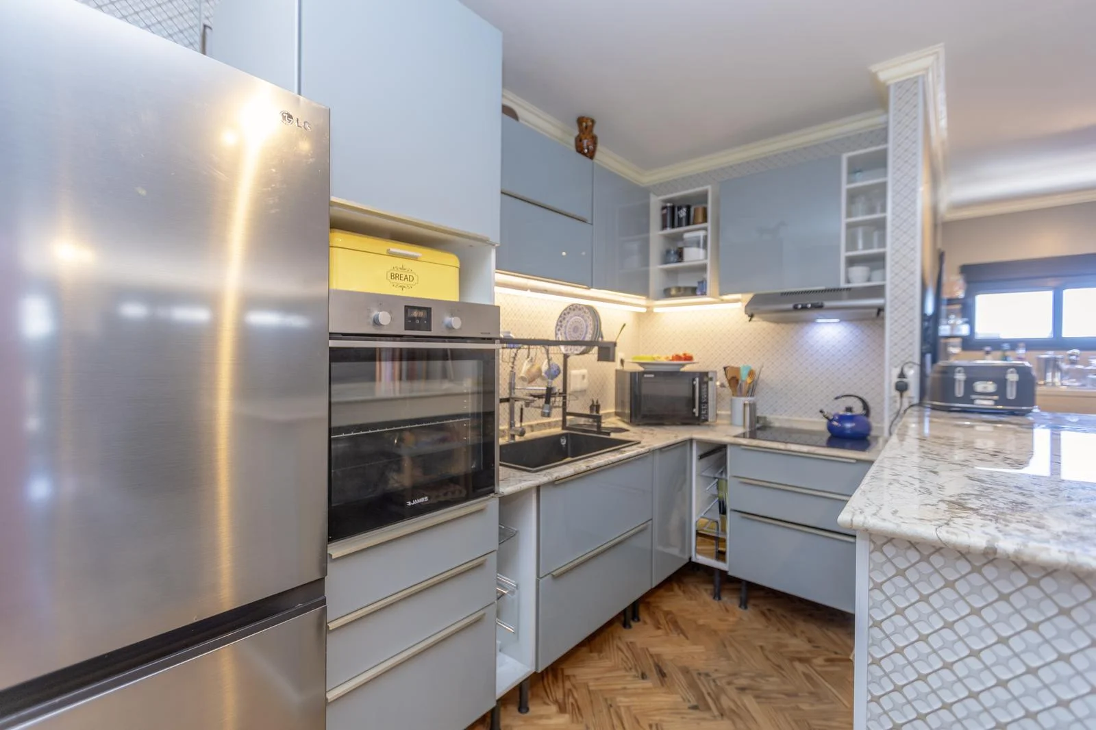 La cocina se presenta integrada, incorporando una península de granito que cumple función de apoyo, división y área social. Se destacan las aberturas con vidrios DVH, que mejoran el confort térmico y acústico, y el cuidado en cada detalle de terminación.