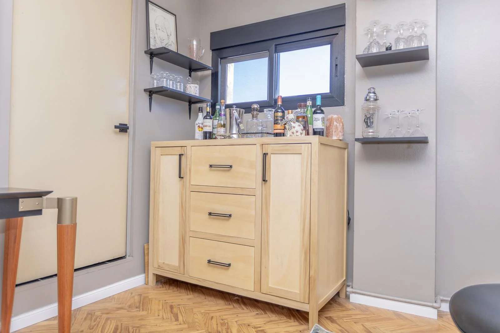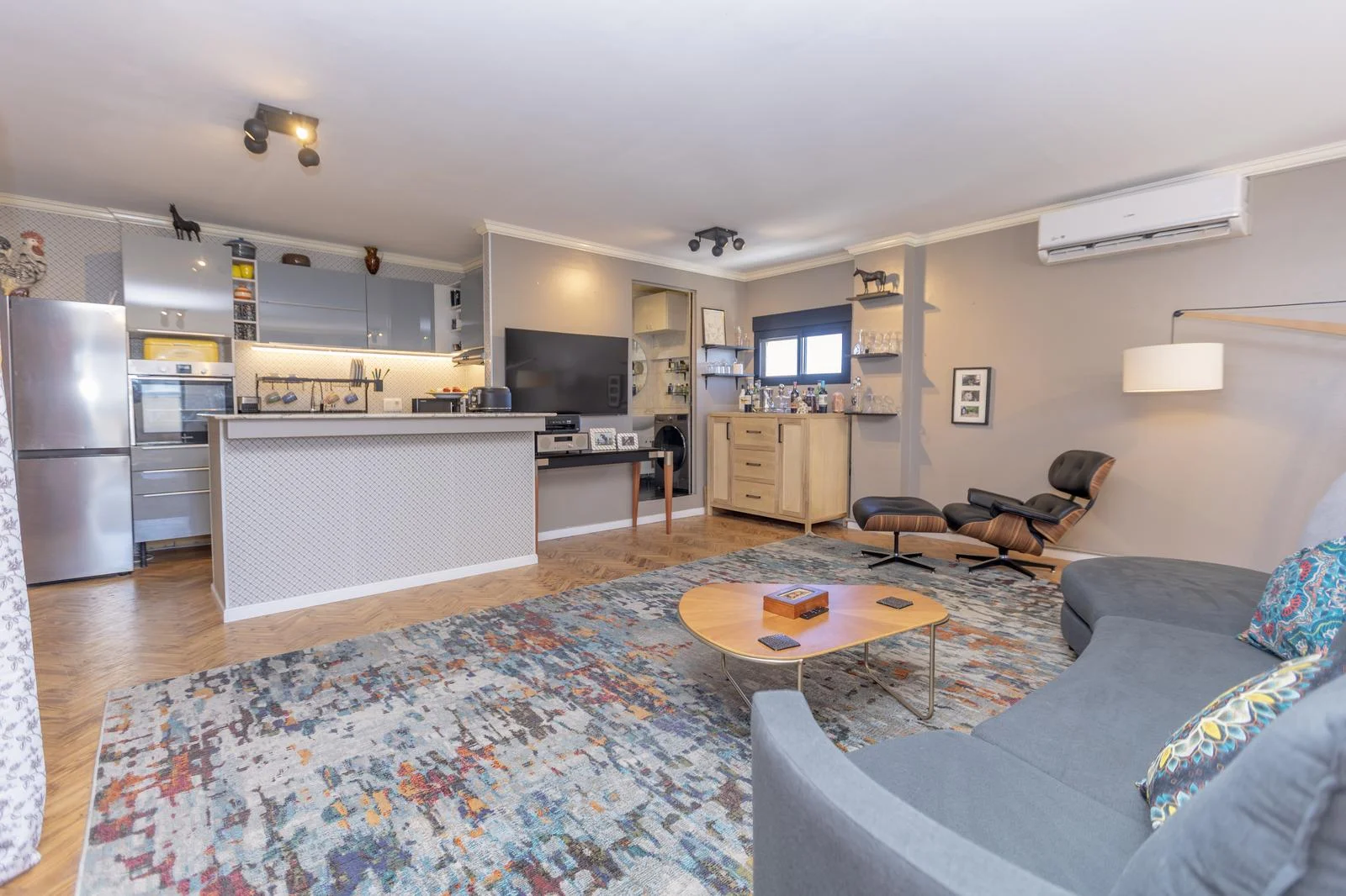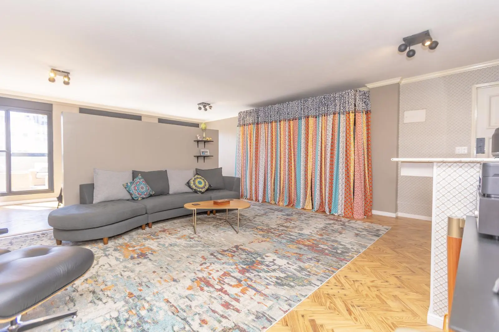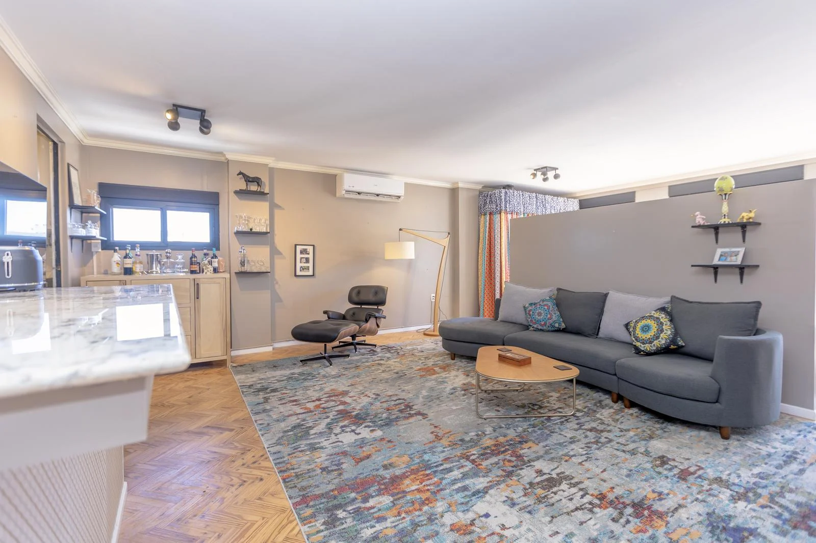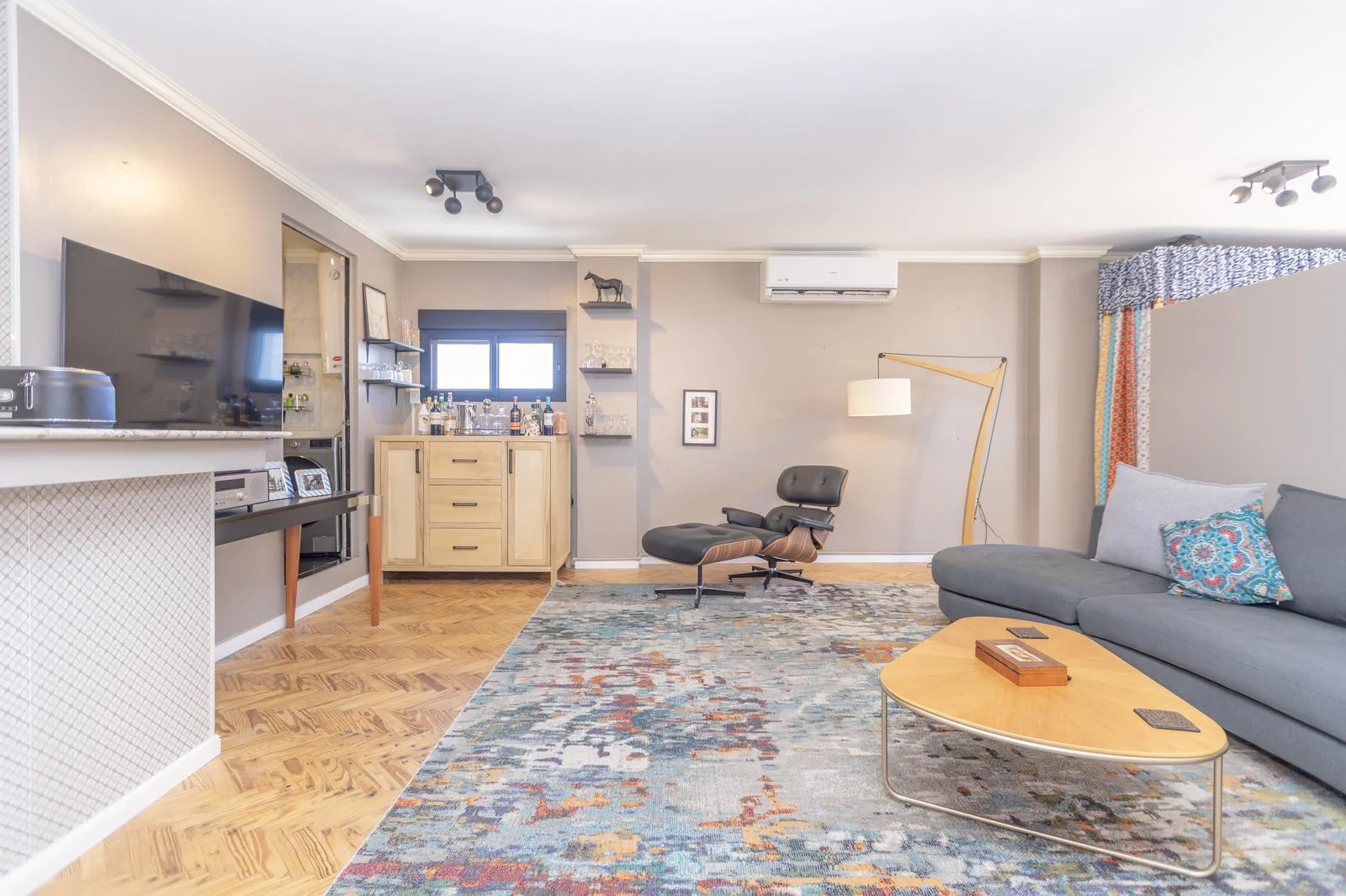A generous living space, featuring custom-made furniture that organizes and elevates the environment.